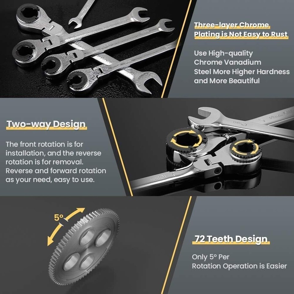 UPGRADE OPEN-END DESIGN: We are an exclusive newly designed open-end flex head ratchet wrench, it is easy to access and rotate bolts that are difficult to reach. The open-end design of the ratchet wrench can help you tighten screws more easily in narrow spaces.