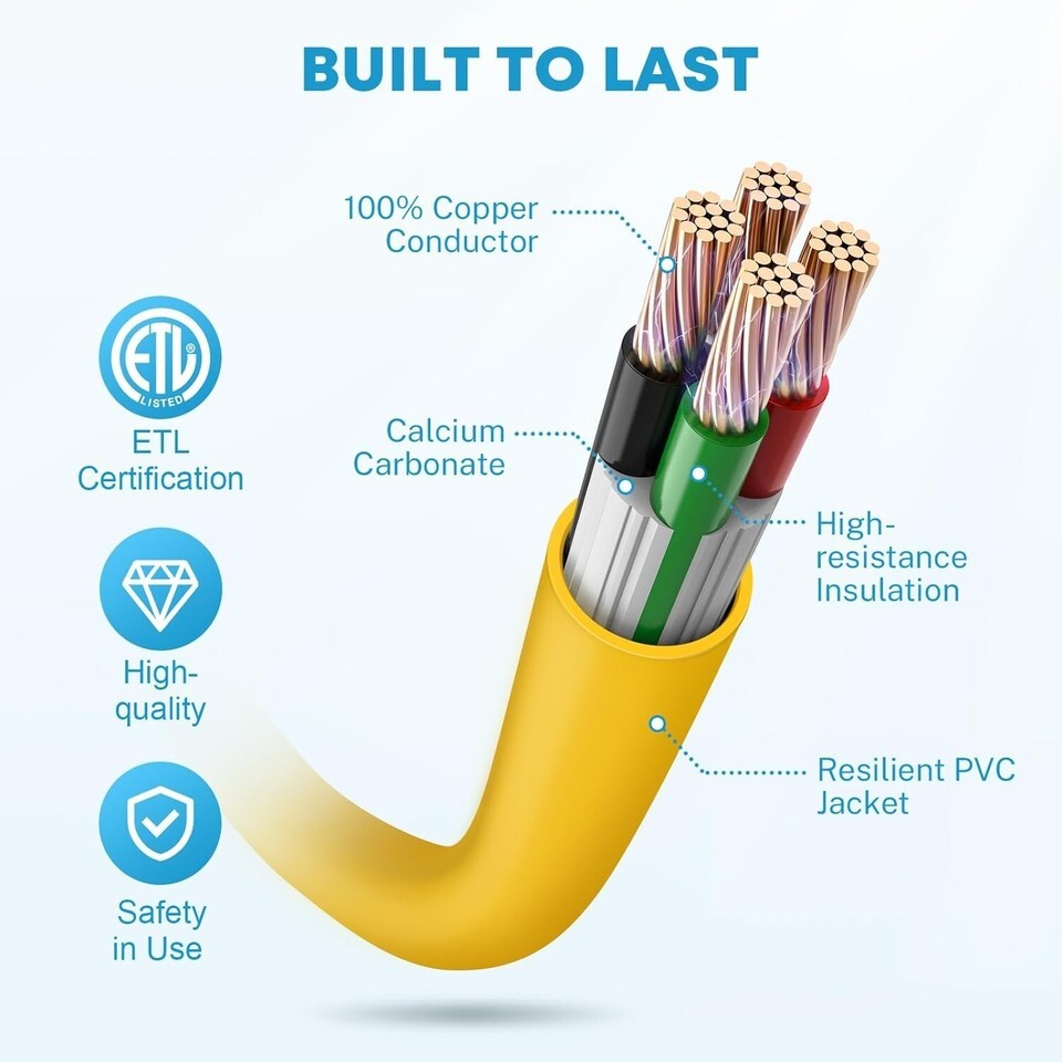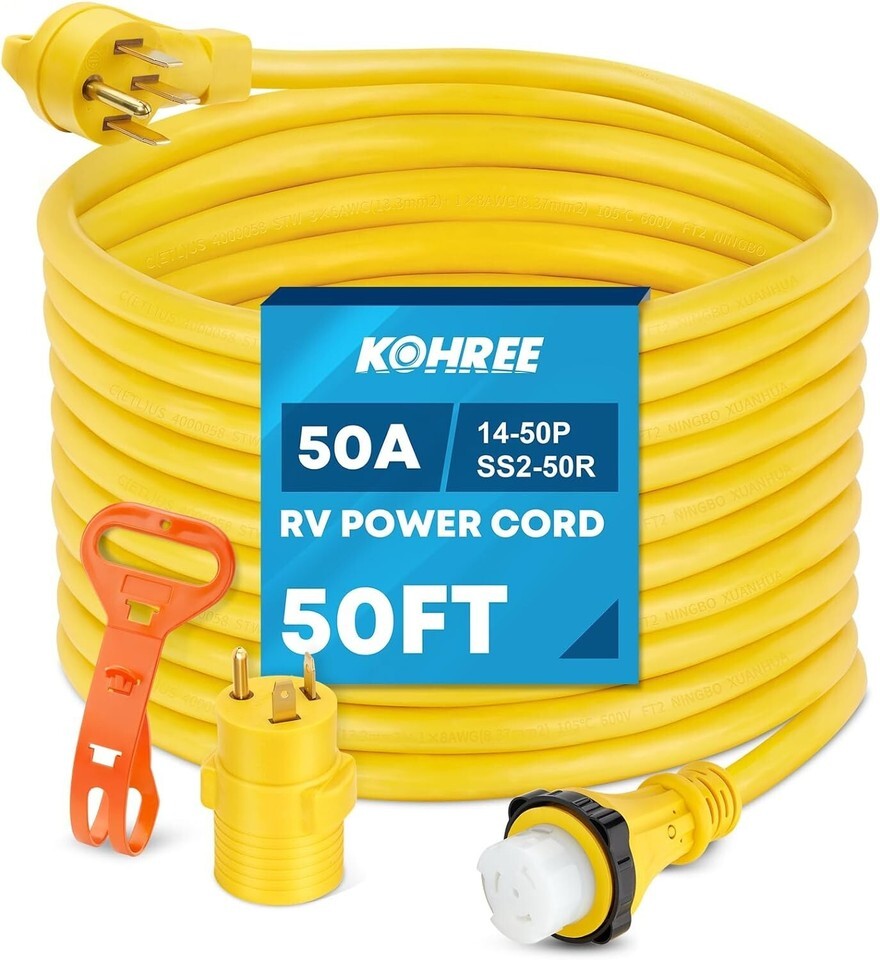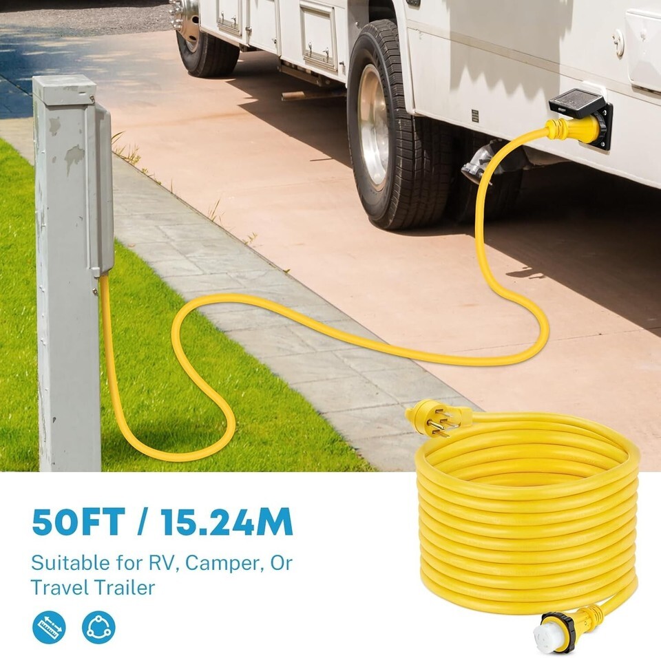 ?Heavy Duty Extension Cord 50FT? 6/3+8/1 Gauge STW wires made of 100% copper coated with PVC provide good conductivity, flexibility and weather resistance. 50' length is enough to connect the campground or park power to your RV, motorhome, trailer or vehicle.