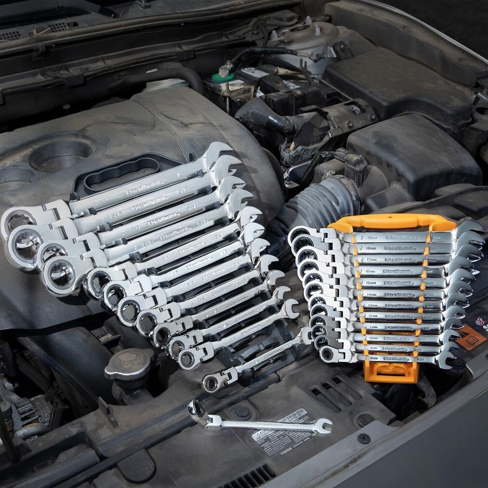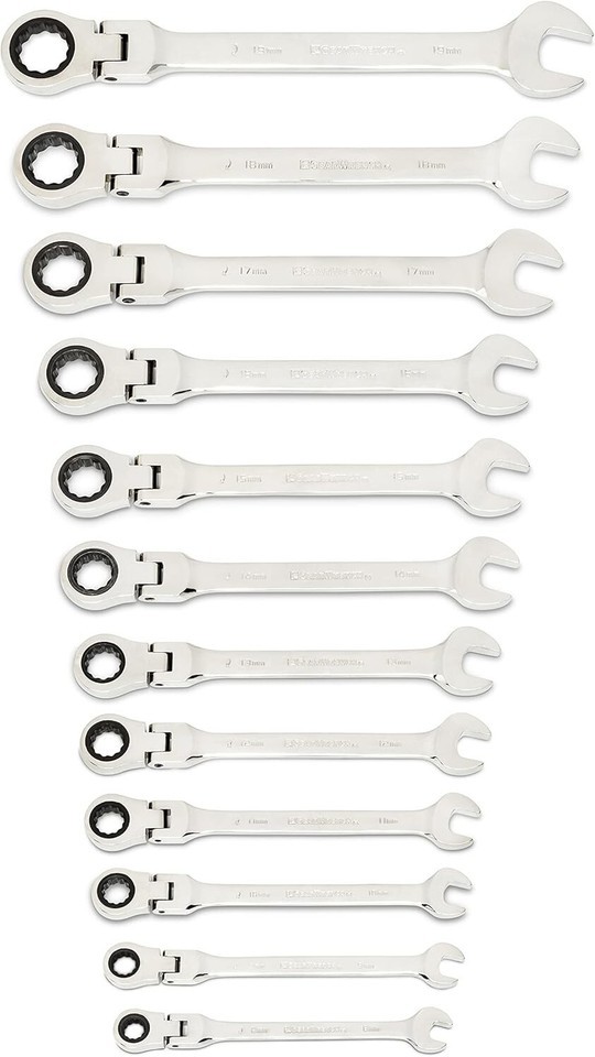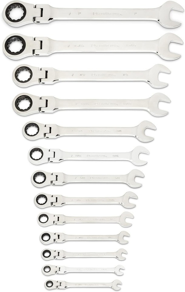 The ratcheting combination wrenches are the original patented ratcheting wrench! The ratcheting box end is designed to need as little as 5 to move fasteners versus 30 for standard wrenches. The wrenches are made from strong alloy steel with a bright, full polish chrome finish. The ratcheting box end features off-corner loading for a better grip on the fastener and reduces fastener rounding. They?re available in various lengths and styles, including: XL length, stubby, flex, stubby flex, and locking flex. Included Sizes: 11/32, 5/16, 3/8, 7/16, 1/2, 9/16, 5/8, 11/16, 3/4, 13/16, 7/8, 15/16, 1, 8mm, 9mm, 10mm, 11mm, 12mm, 13mm, 14mm, 15mm, 16mm, 17mm, 18mm, 19mm