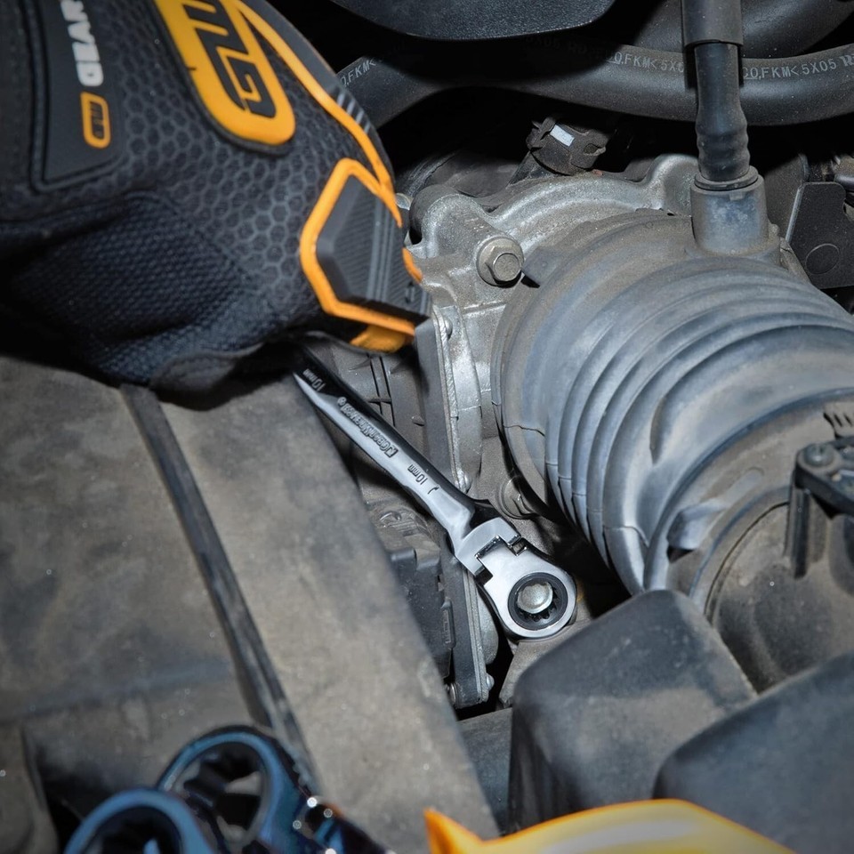 72 tooth ratcheting box end needs a minimal 5 to move fasteners vs. 30 for standard wrenches