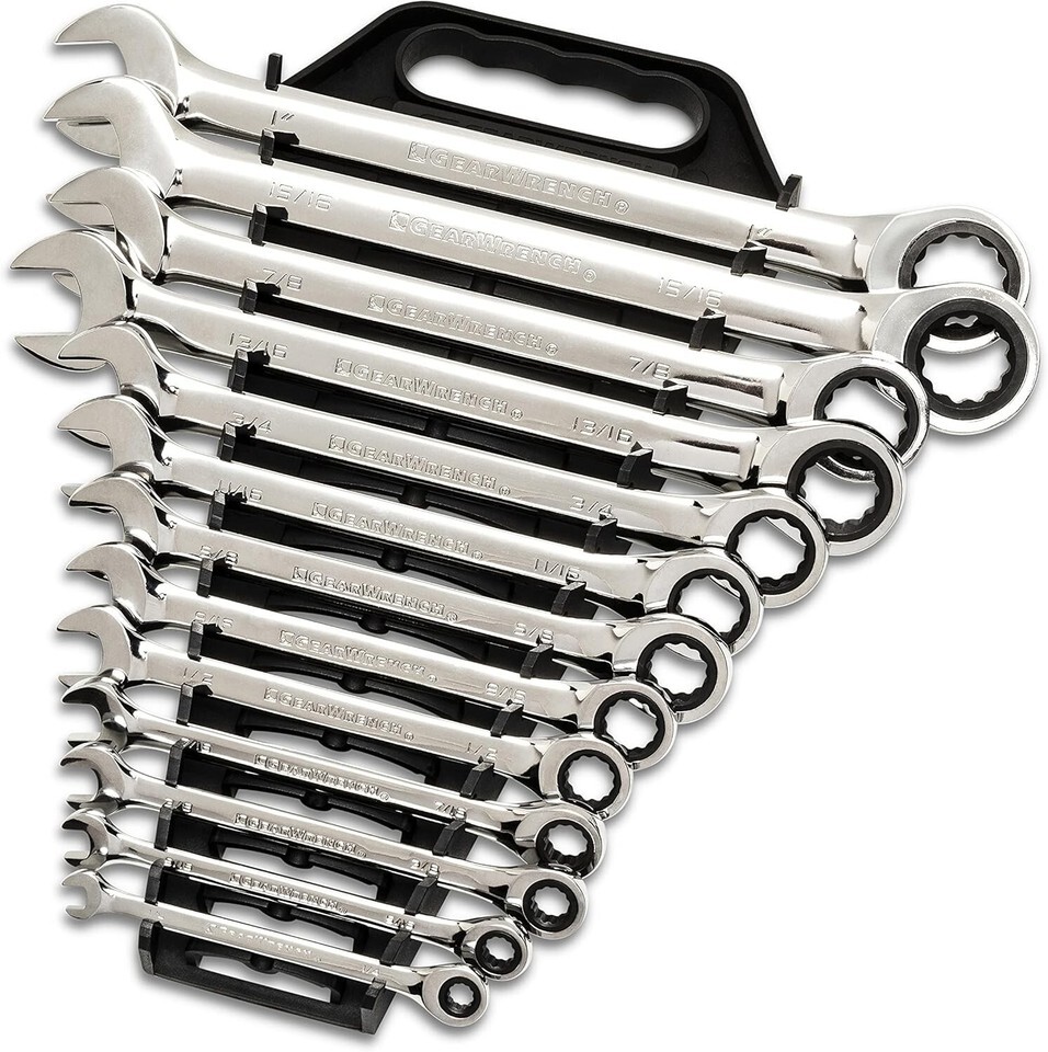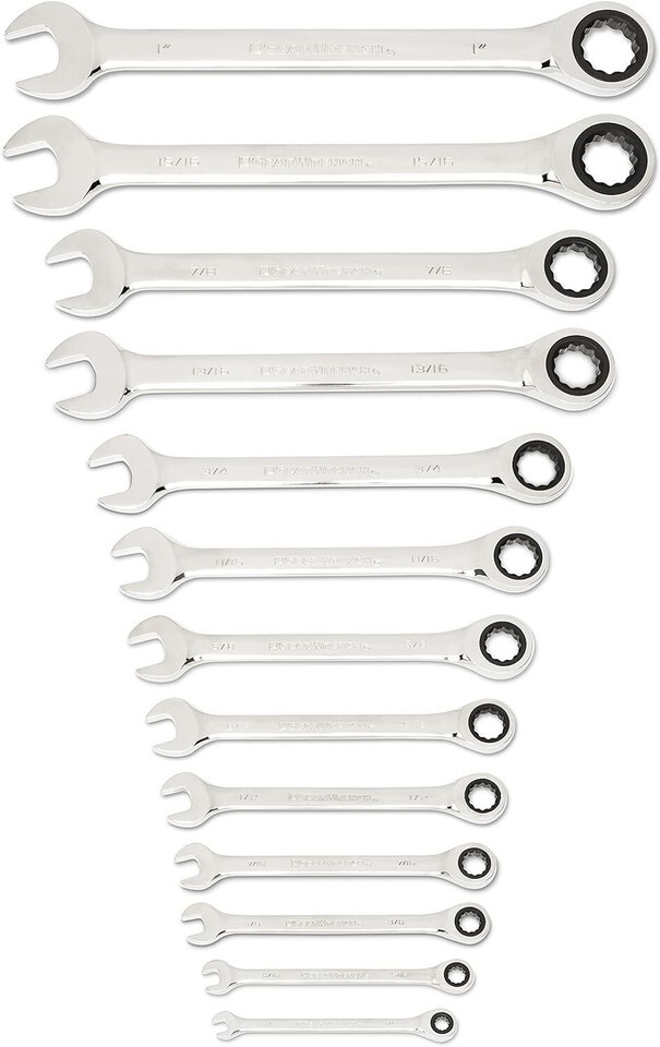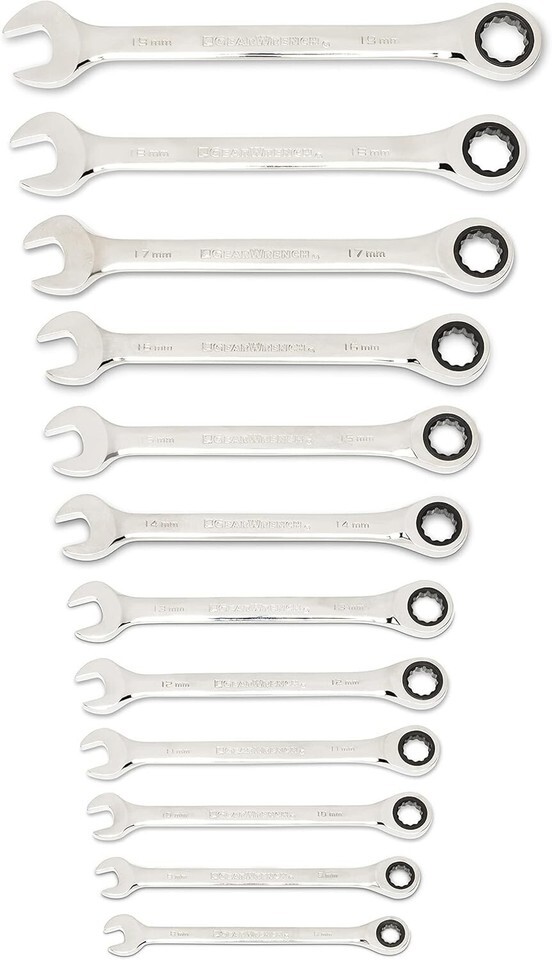 The ratcheting combination wrenches are the original patented ratcheting wrench! The ratcheting box end is designed to need as little as 5 to move fasteners versus 30 for standard wrenches. The wrenches are made from strong alloy steel with a bright, full polish chrome finish. The ratcheting box end features off-corner loading for a better grip on the fastener and reduces fastener rounding. They?re available in various lengths and styles, including: XL length, stubby, flex, stubby flex, and locking flex. SAE: 1/4, 5/16, 3/8, 7/16, 1/2, 9/16, 5/8, 11/16, 3/4, 13/16, 7/8, 15/16, 1 Metric: 8mm, 9mm, 10mm, 11mm, 12mm, 13mm, 14mm, 15mm, 16mm, 17mm, 18mm, 19mm