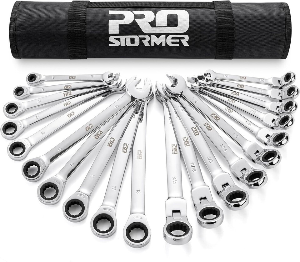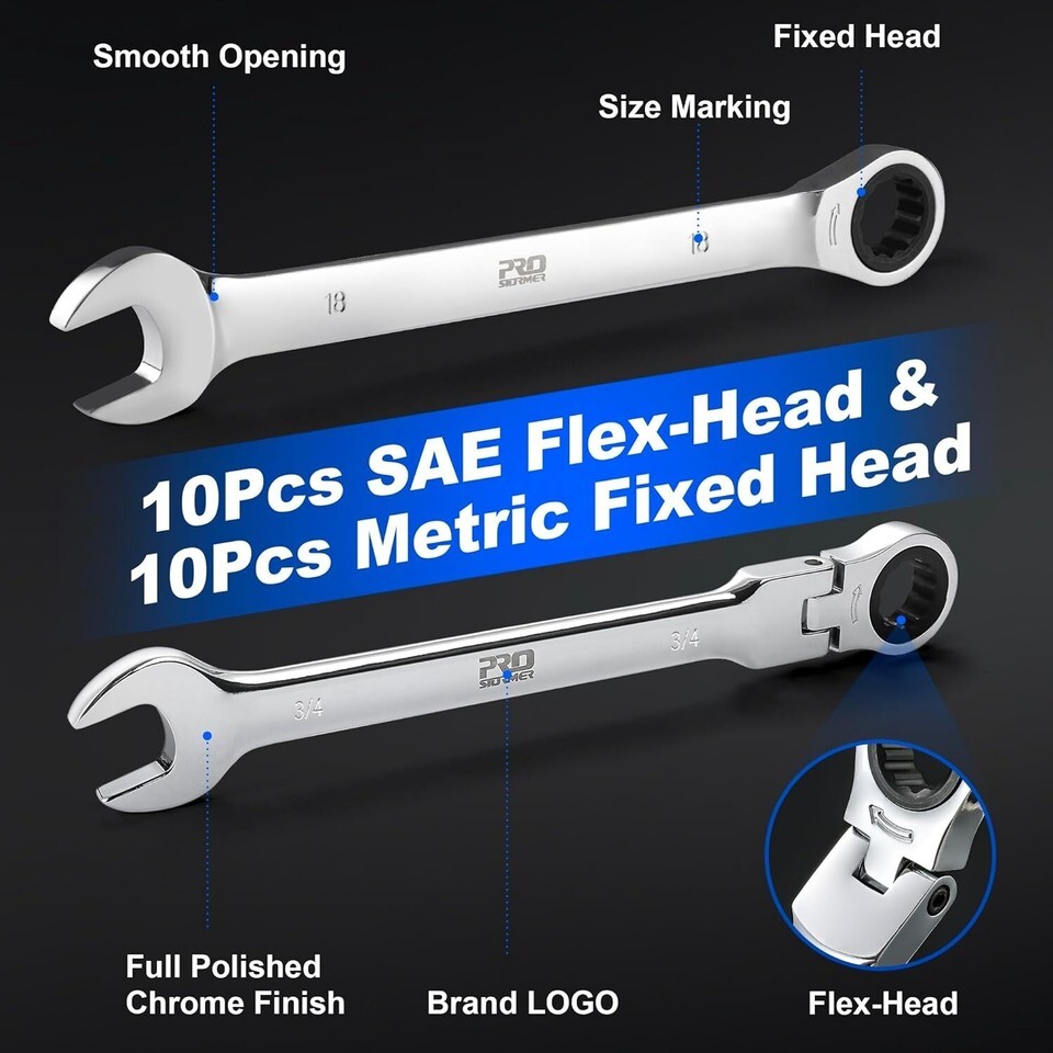 [20Pcs SAE Metric Sized Wrenches] - This wrench set include 10pcs Flex-head wrenches and 10pcs Fixed head Wrenches. There are the most common used sizes: includes 1/4", 5/16", 11/32", 3/8", 7/16", 1/2", 9/16", 5/8", 11/16", 3/4" 6mm, 8mm, 10mm, 12mm, 13mm, 14mm, 15mm, 16mm, 17mm, 18mm.