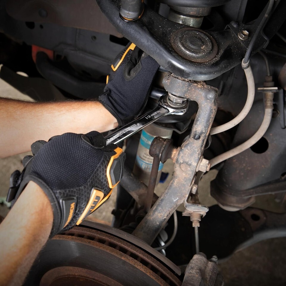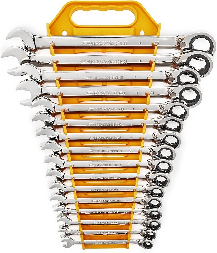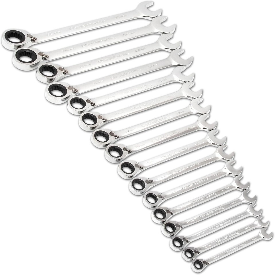 The reversible ratcheting combination wrenches from are a staple for every tool box. The flush-mounted reversing lever allows the user to switch motion left to right without needing to remove the wrench from the fastener increasing productivity. The 15 offset on the ratcheting box end allows for greater knuckle clearance and safer access to the fasteners. The ratcheting box end is designed to need as little as 5 to move fasteners versus 30 for standard wrenches and features off-corner loading for a better grip on the fastener and reduces fastener rounding. The wrenches are made from strong alloy steel with a bright, full polish chrome finish. .com combines the speed of a ratchet with the access and control of a wrench with this 16-piece metric set of reversible combination ratcheting wrenches (model 9602). They offer the easy of 5 degrees of movement to turn fasteners, versus 30 degrees on standard combination wrenches. The reversing lever allows you to switch motion from left to right without removing the wrench, and the 15-degree offset allows for safe operation above the work surface for additional knuckle small ratcheting box end head design enables access to tight spots where a ratchet won't fit. The open end allows ratcheting of nuts and bolts without removing the wrench from the fastener, making jobs go faster and easier. This set comes with a wrench locker rack that holds the wrenches in place for easy transport and larger image. See larger 's in the Box16-piece metric wrench set with molded wrench rack and the following sizes of wrenches:8 mm to 19 mm, 21 mm, 22 mm, 24 mm, and 25 mmAbout Since launching the original patented 50 ratcheting wrench, has continuously led with breakthroughs in pass-through ratchets, sockets, screw/nut drivers, pliers, and specialty tools. No matter the industry you find yourself in, has the tools to fit your needs -- from the precise to the nearly indestructable. hand tools are warranted for life to be free of defects in material and 16-Piece Metric Reversible Combination Ratcheting Wrench SetAt a GlanceReversing lever for easy motion switch from left to right15-degree offset for additional knuckle clearance5-degree ratcheting arcSleek head design for access to tight spotsSurface Drive provides a stronger grip on fasteners and reduces roundingPolished chrome finish