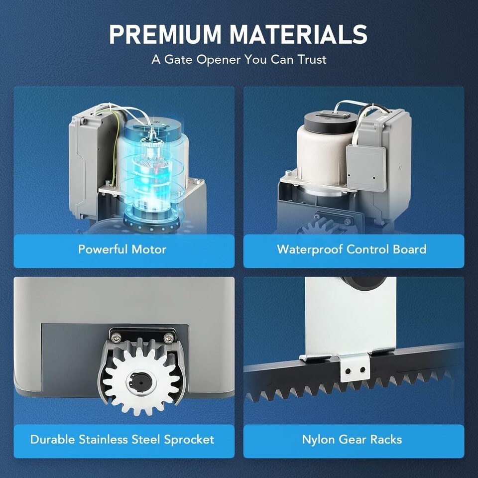 Fast and Easy to Set Up: This left/right sliding gate opener is easy to install with all the necessary tools included; once installed, you can enjoy its smooth and quiet operation thanks to the 12 lightweight nylon gear racks