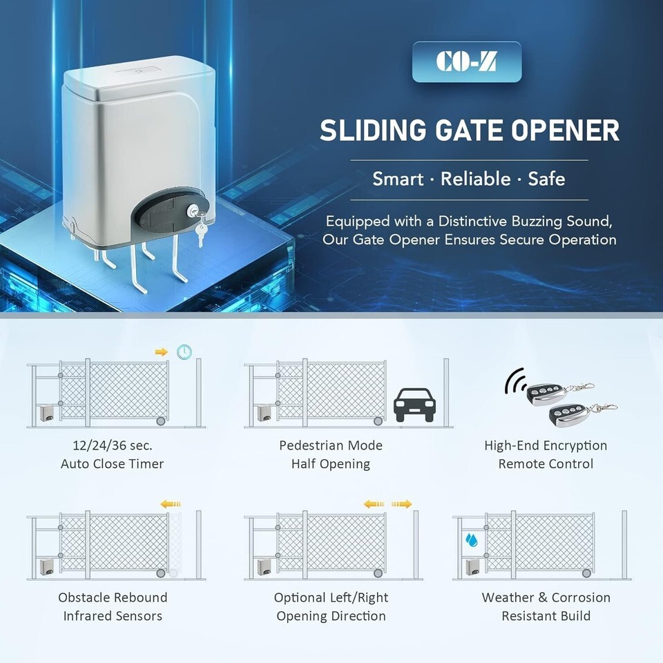Enjoy Full Protection: Our electric gate opener buzzes and responds by stopping and reversing if any obstacles are detected by the infrared sensors; also provides pedestrian mode, gentle starts stops, and overheat protection to ensure your safe use