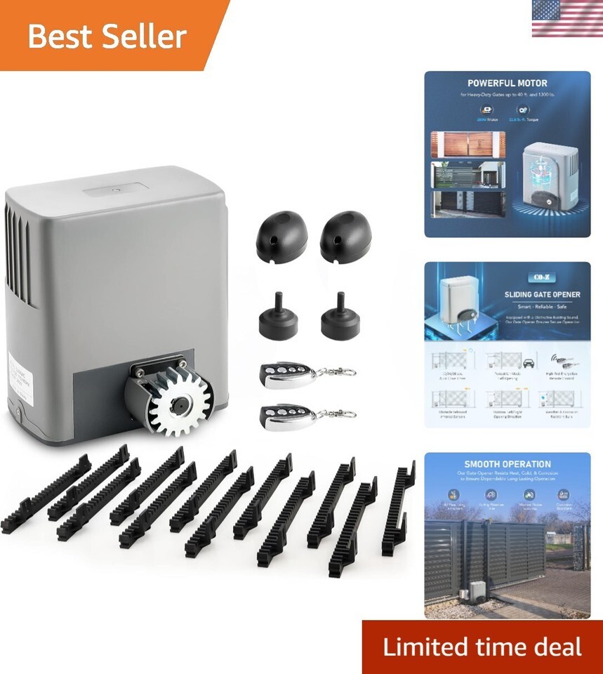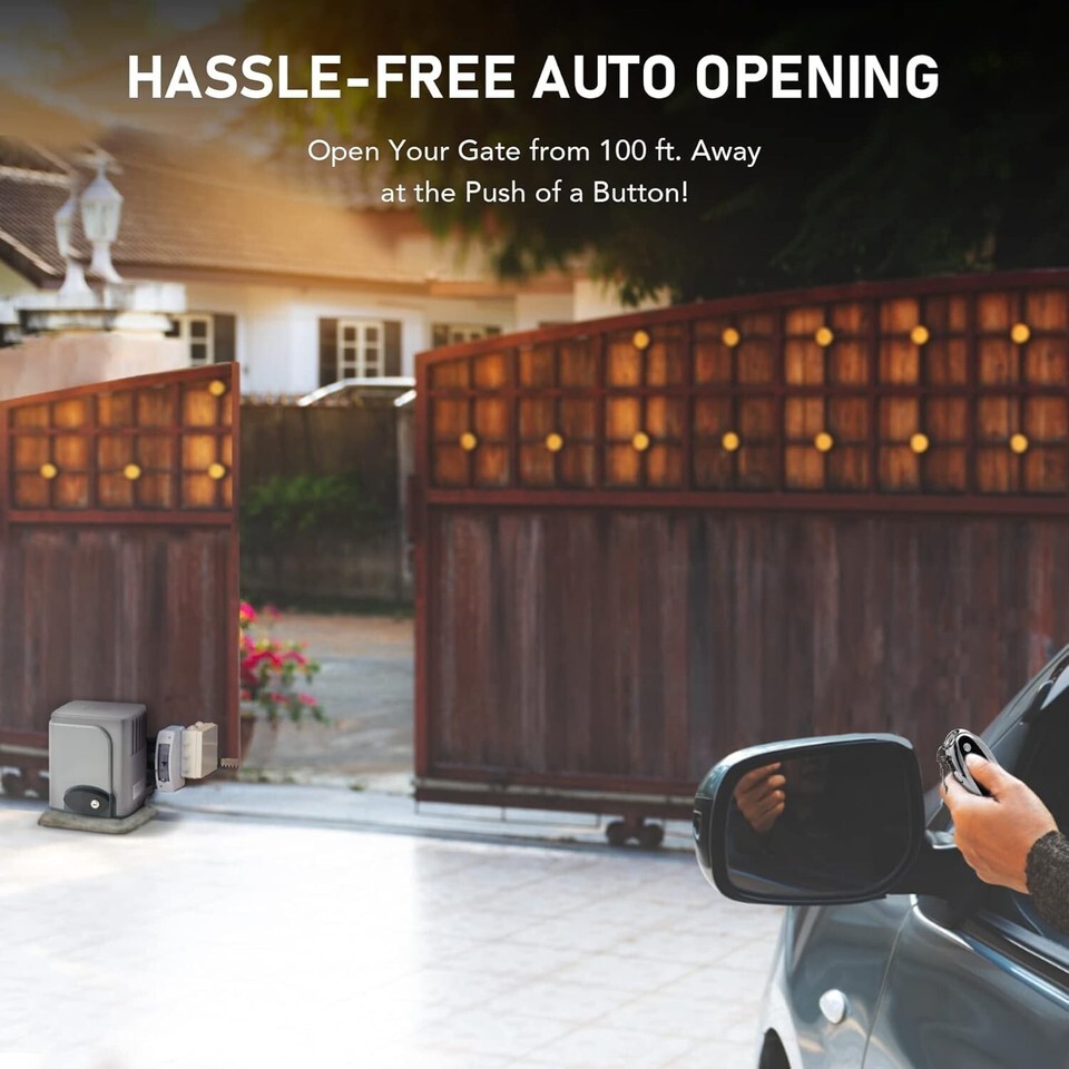 Access Secure Your Property with Ease: 's automatic sliding gate opener handles doors up to 40 ft. long and weighing up to 1400 lb., with 2 remote controls and 3 auto close presets offering hands-free access control