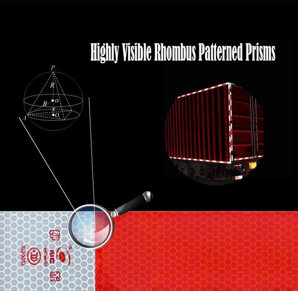 [Ultra Reflective:] Specializing in the production of reflective tape for over 10 s, and providing brighter and more durable reflector tape for customers. Honeycomb pattern design DOT tape and made of PET material. Highly visible rhombus patterned prisms (Red 6" and White 6") color gives ultra reflective effect. It is mountable at any position to reflect light back from far away and from all directions.