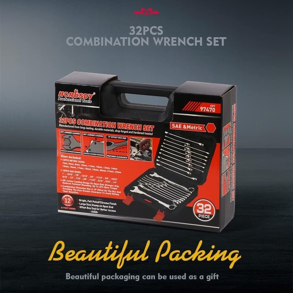 32-Piece Combination Wrench Set, SAE and Metric, 1/4"-1" 7mm-22mm, 12 Point, Chrome Vanadium Steel Construction with Case