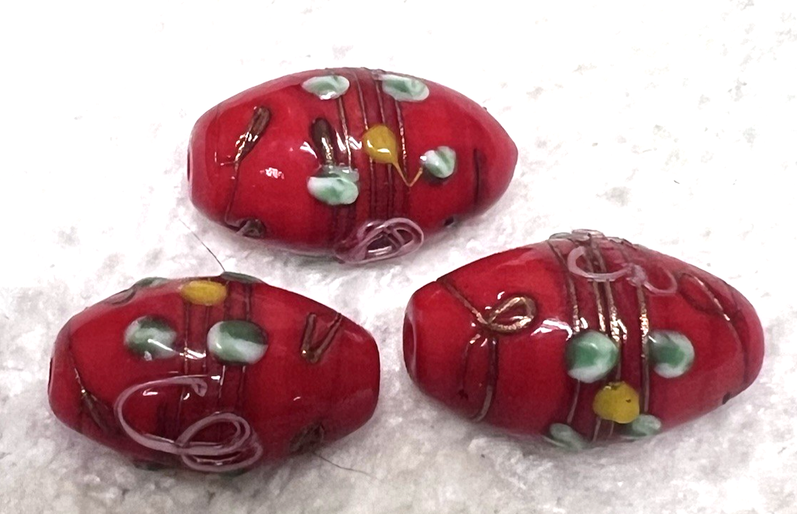 3 Vintage Handmade Art Glass Lampwork Beads Reds 7/8 L 1/2 Fat Center