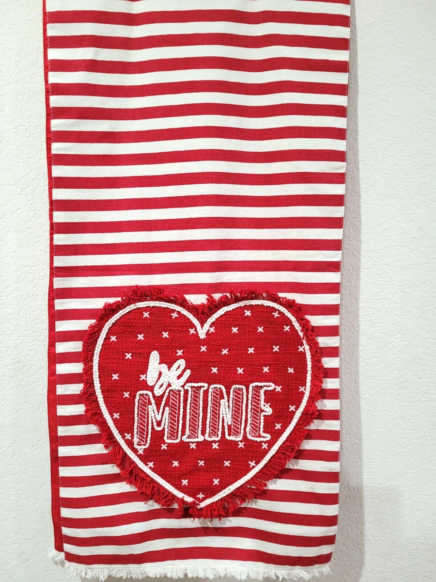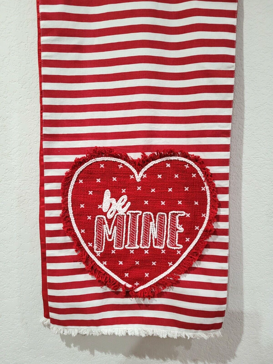 Up for sale we have this amazing table runner for your Valentines decor by Nicole Miller. Table runner is soooo cute it is striped and each end has an applique heart the reads Be Mine. Great looking runner and a great price. Runner is 16" x 72".