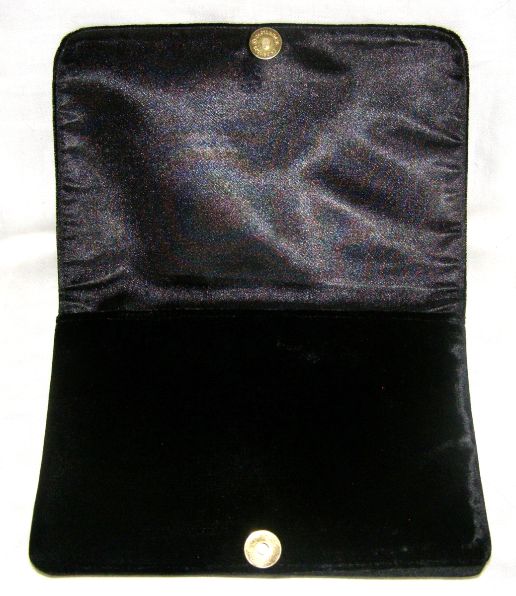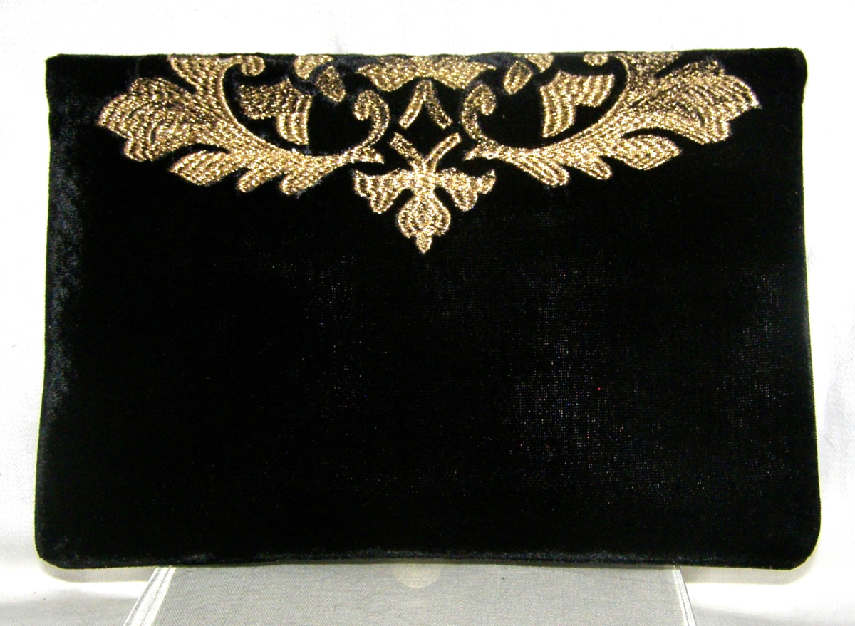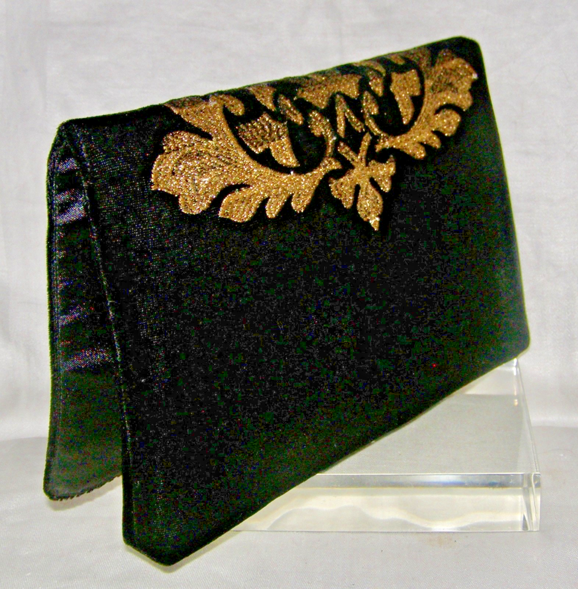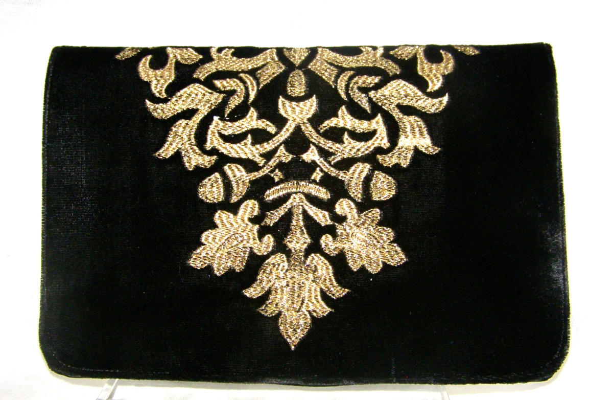VINT. SHIRALEAH,CHICAGO BLACK VELVET GOLD METALLIC THREAD EMBROIDERED CLUTCH BAG