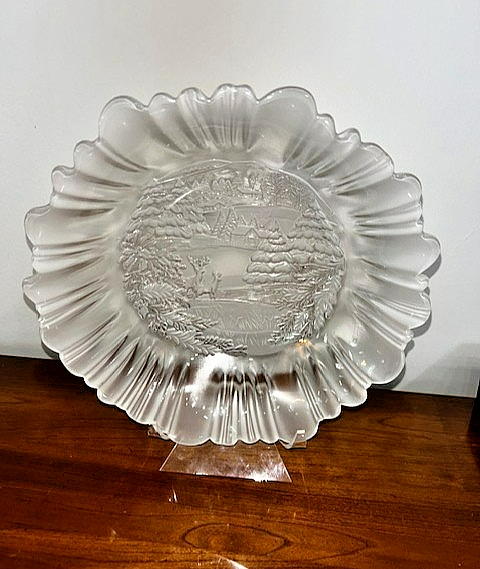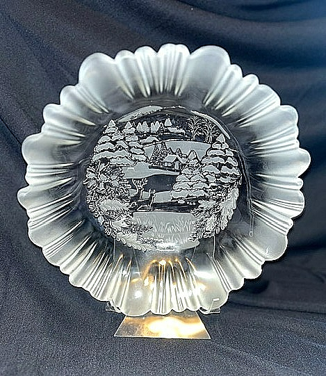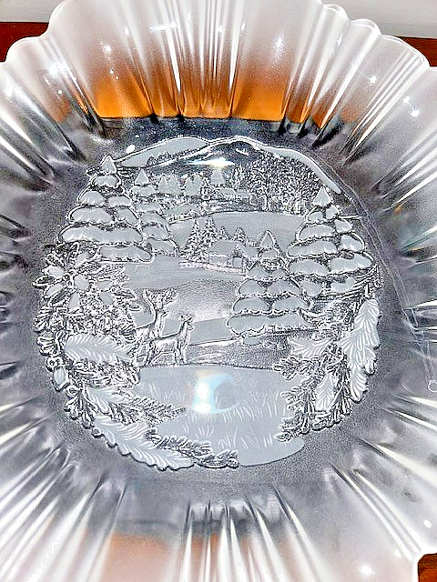 This round bowl has a charming scene with snow covered pines, deer, pond, and homestead, perfect for the holiday season or year-round.