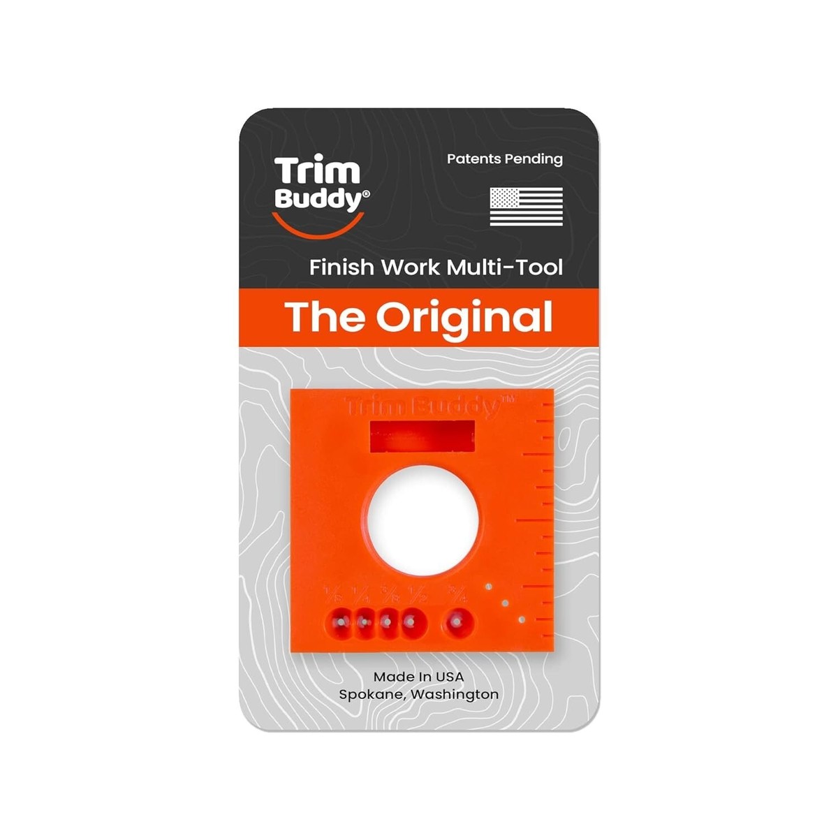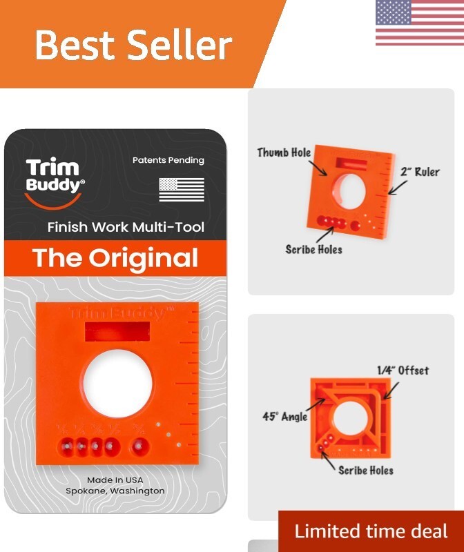 multi tool comes with 5-in-1 tools to help speed up the finishing work. The compact size makes it easy to use and store. This multi-tool sets 1/4 inch trim reveal on doors and windows, has a 2 inch ruler for measuring and marking short offsets, easy to scribe trim for the perfect fit, marks 45 cutting or reference lines, and marks offset parallel lines for nails, screws or cutting. Made in the USA