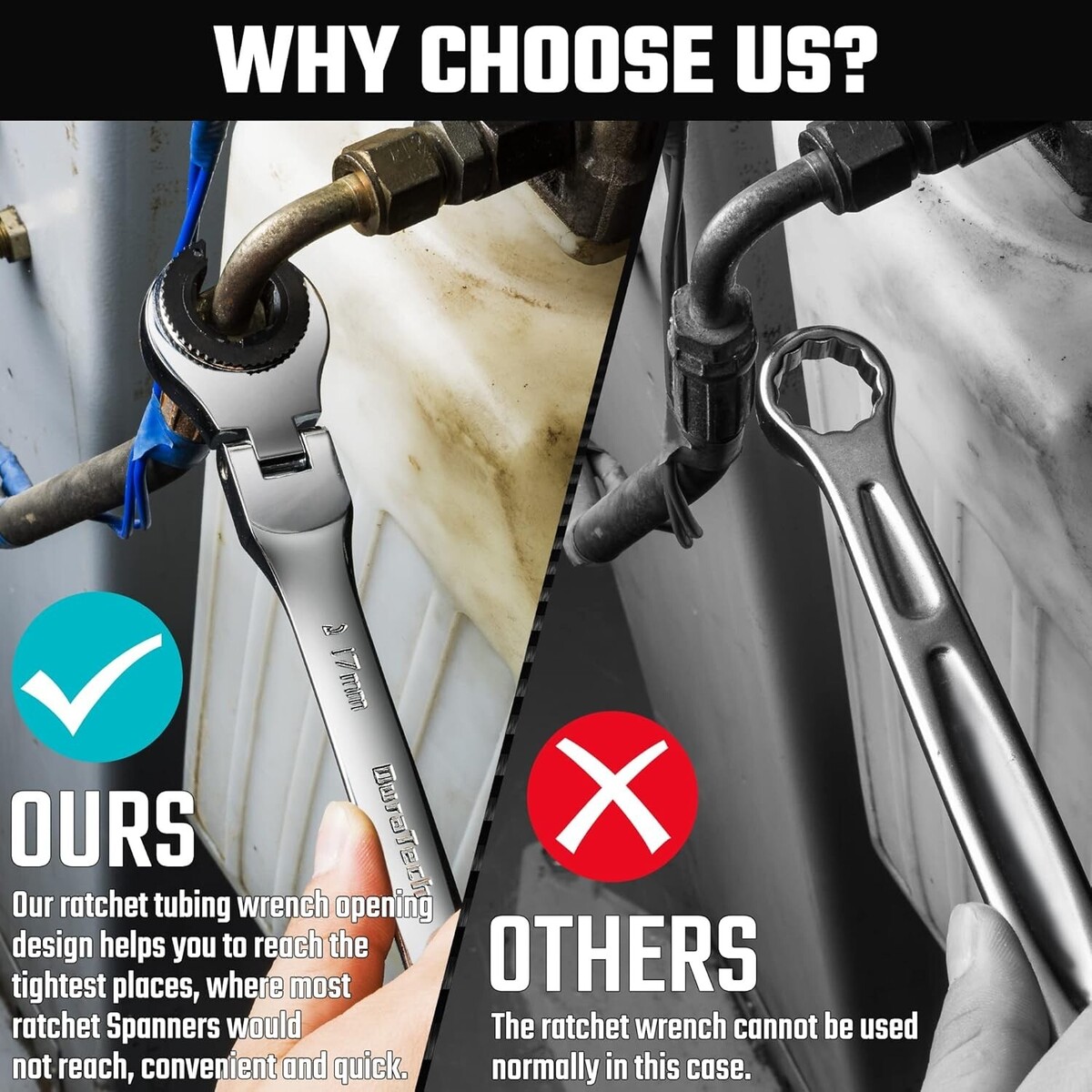 OPEN-END DESIGN: One end is an open-end wrench and the other end is a open-end and flexible-head ratchet wrench,Meet your different needs.Ratchet tubing wrench open-end dedsign helps you to make it easier to tighten the screws in a narrow space.