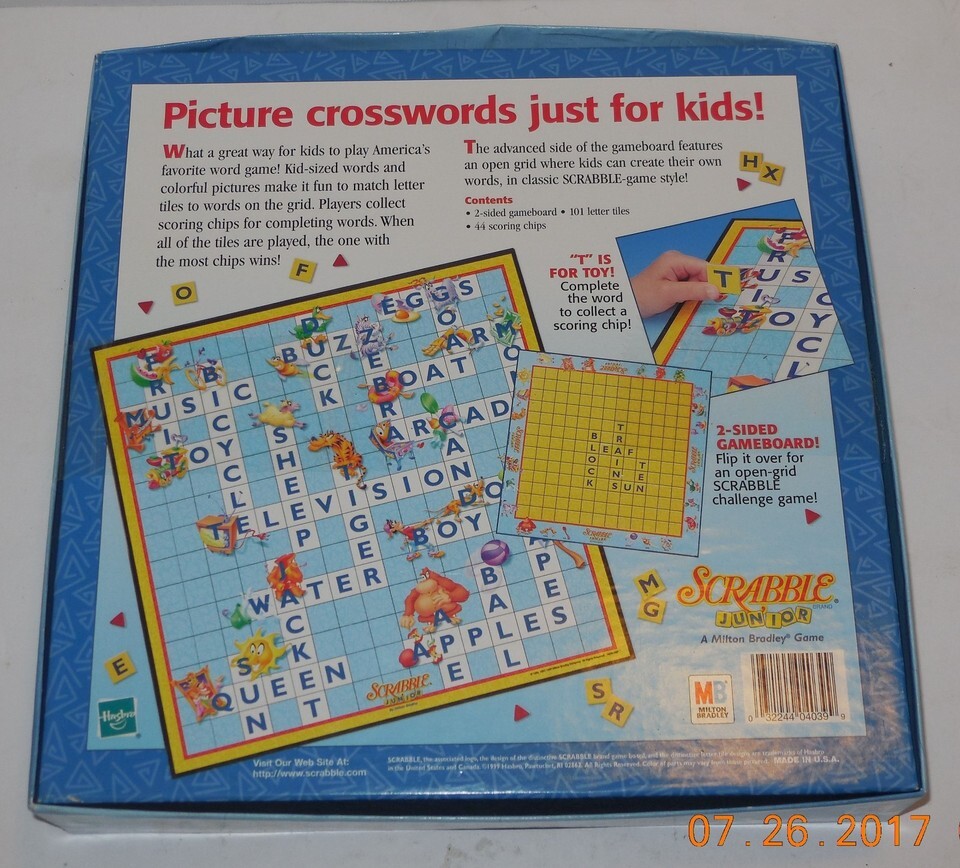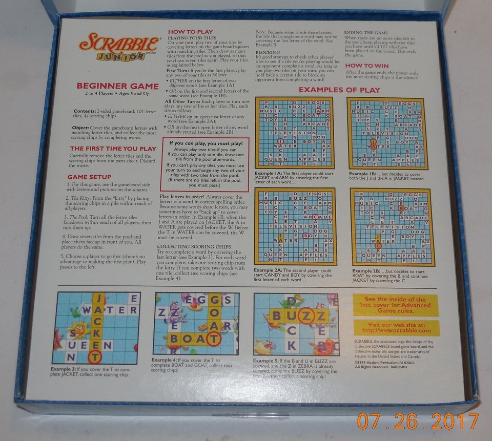 For Sale is a 1999 Milton Bradley SCRABBLE JUNIOR BOARD GAME Ages 5+ Child's First Crossword 100% Complete. it in good Used condition. comes with the Pieces as seen in the pictures provided what you see is what you will receive. Please ask Any and All Questions prior to purchasing. Fast Same or Next day shipping with Free Delivery Confirmation within the U.S. Payment Due within 7 days of purchase (if you need more time please let us know In advance) we love to combine shipping is always a Yes and Most of the time Additional Items Ship for free.