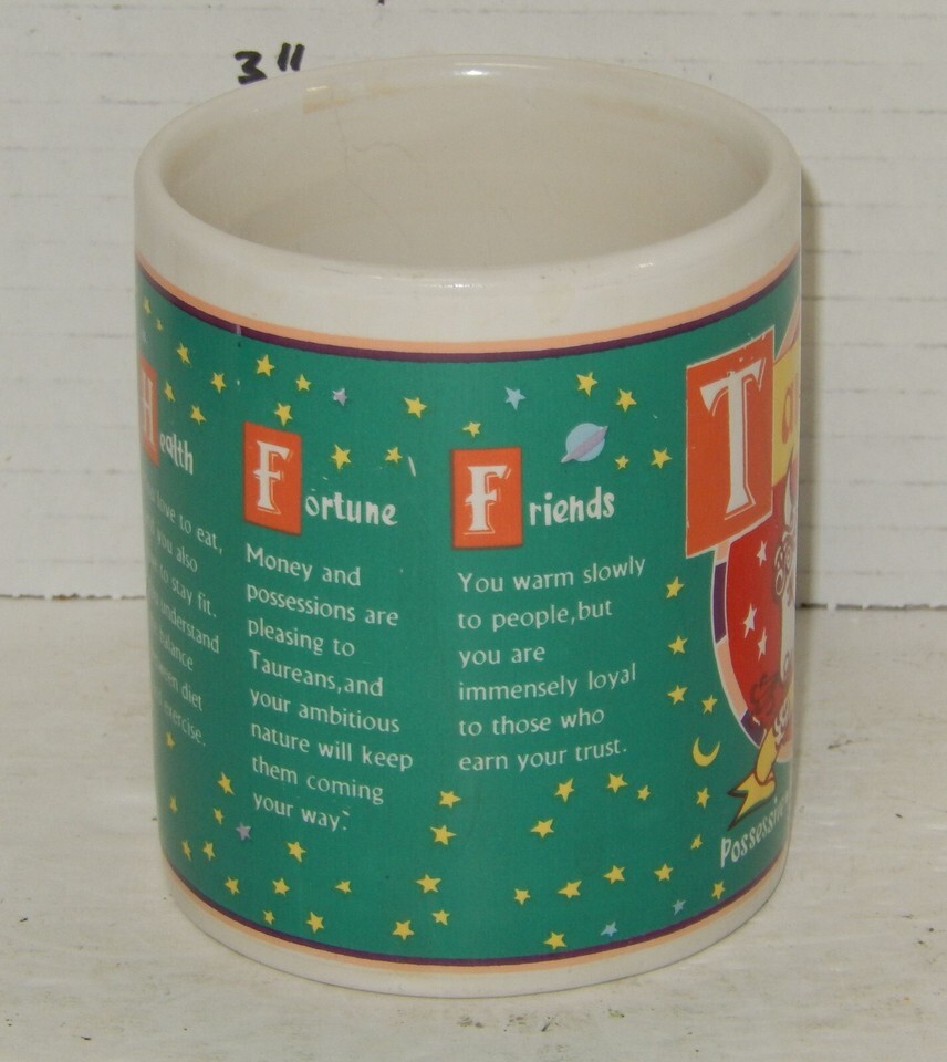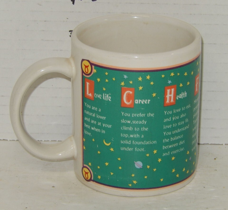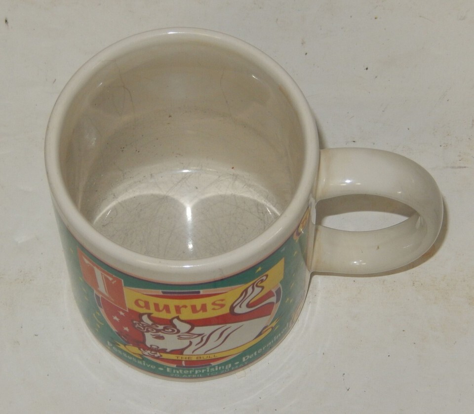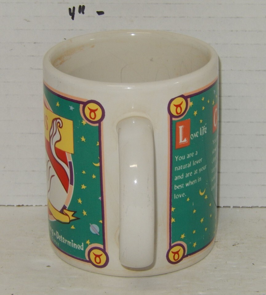 For Sale is a rare and hard to find Taurus the Bull Birthday Mug Cup Zodiac. its In good USED Condition as pictured. Please ask Any and All Questions prior to purchasing. Fast Same or Next day shipping with Free Delivery Confirmation within the U.S. Payment Due within 7 days of purchase (if you need more time please let us know In advance) we love to combine shipping is always a Yes and Most of the time Additional Items Ship for free. SKU4MS