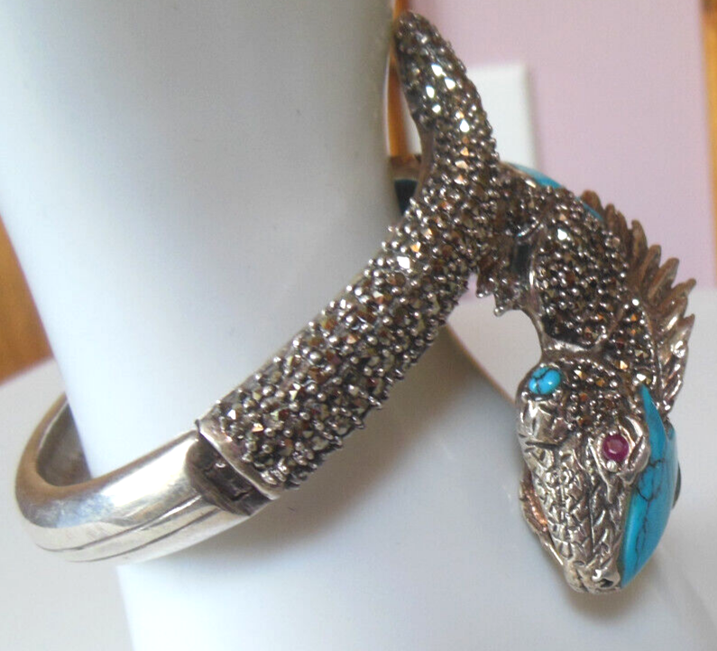Stamped 925 Silver Iguana Lizard Bracelet Turquoise, Marcasite, Genuine Ruby Eyes