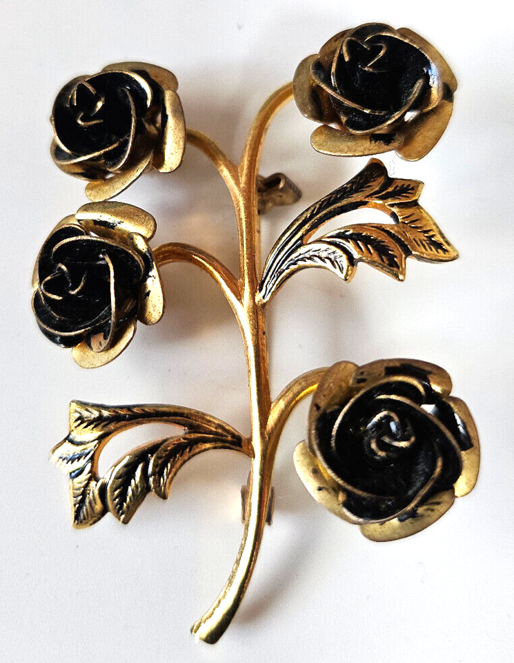 Vintage Signed Spain Gold-tone Black Enamel Rose Brooch 2" x 1. 3/8"