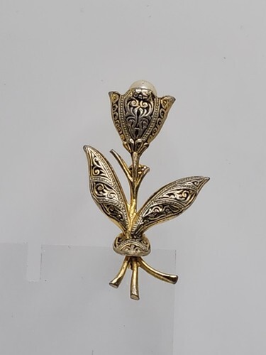 This vintage brooch from Spain features a striking design of a black enamel rose on a gold-tone metal setting, measuring 2 inches in length and 1.3/8 inches in width. The piece is signed, showcasing its authenticity and craftsmanship. With its elegant color combination and intricate detailing, this brooch is a timeless accessory that adds a touch of sophistication to any outfit. Perfect for vintage jewelry collectors or those looking for a unique statement piece.