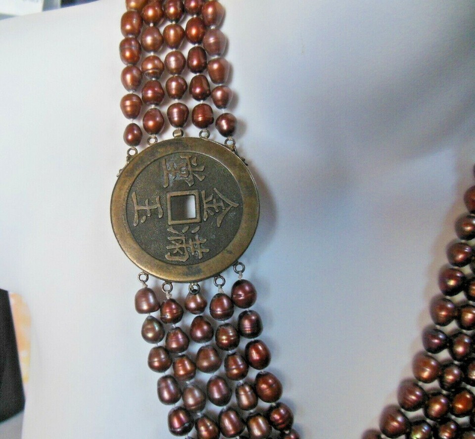 5 Strand Brown/Bronze Knotted Pearl Necklace W/925 Sterling Chinese Coin Clasp