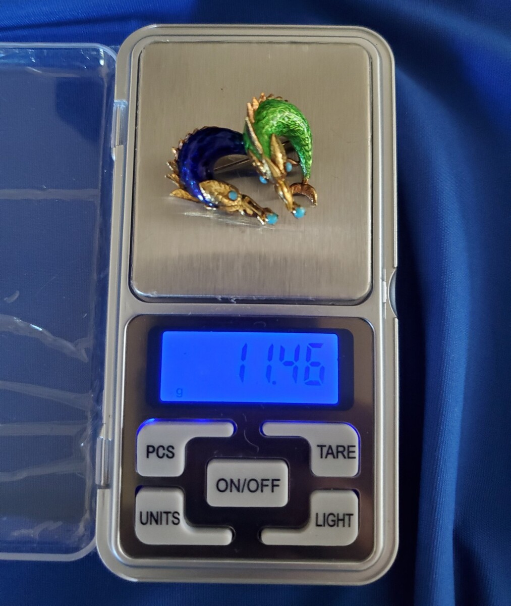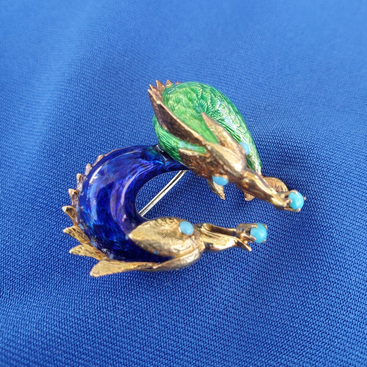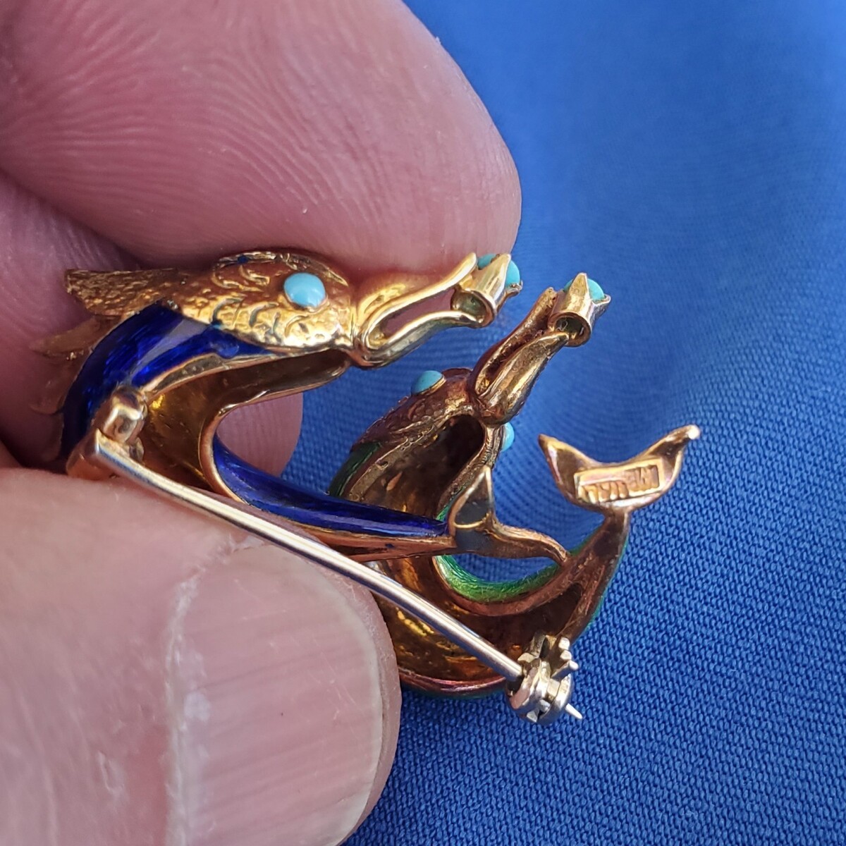 Mythical Dolphin Dragon Brooch Deco Guilloche Enamel Turquoise 18k Gold 11.46 Gr