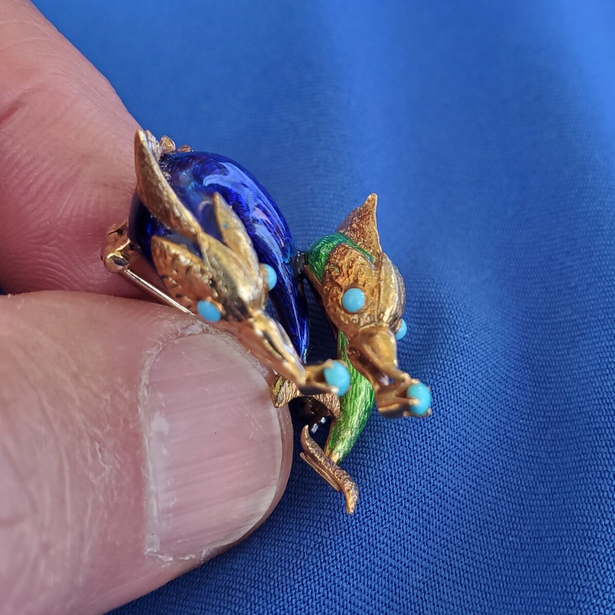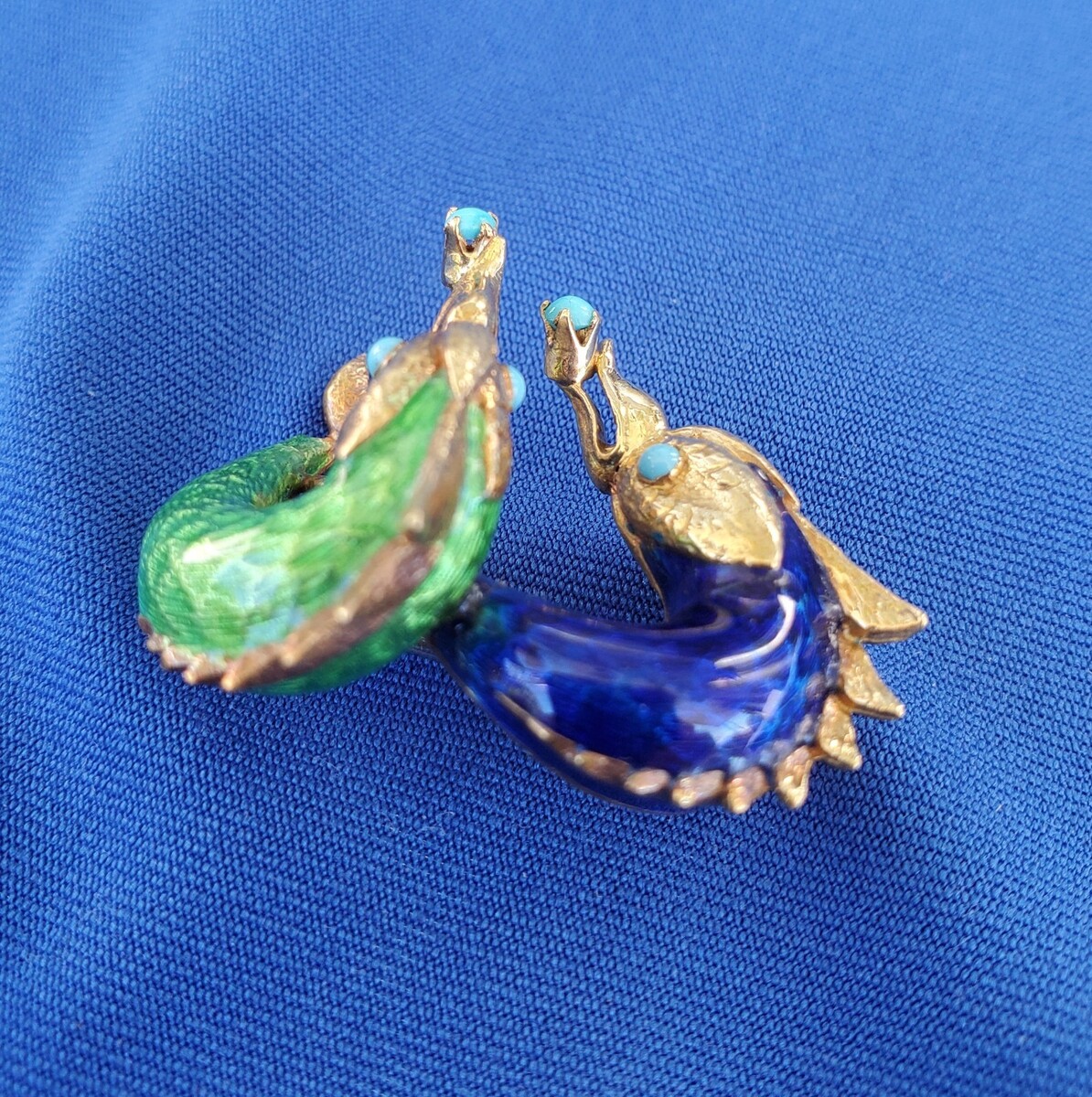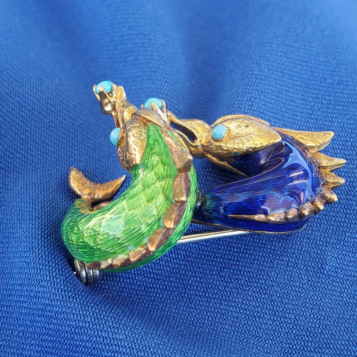Mythical Dolphin Dragon Brooch Deco Guilloche Enamel Turquoise 18k Gold 11.46 Gr