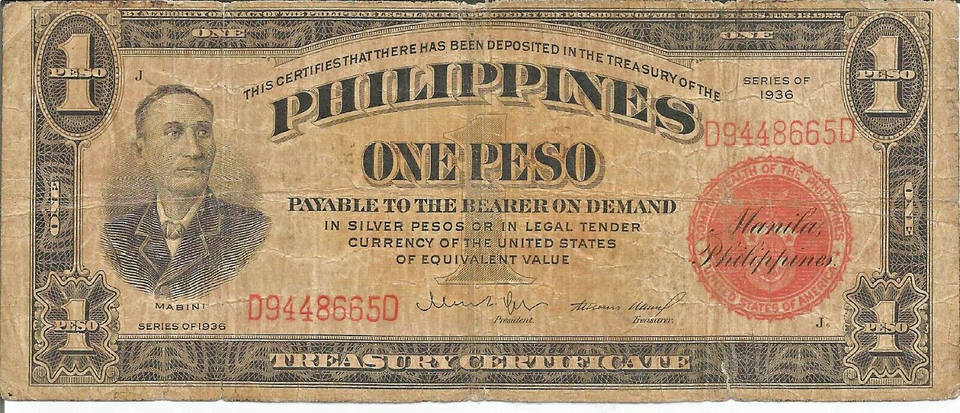 Philippines 1 Peso Series of 1936 Circulated Banknote #112