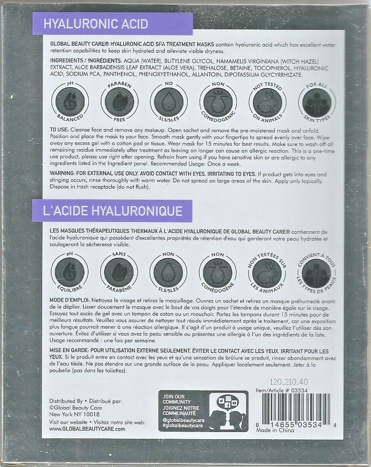 Global Beauty Care Hyaluronic Acid Spa Treatment Mask 2 pack