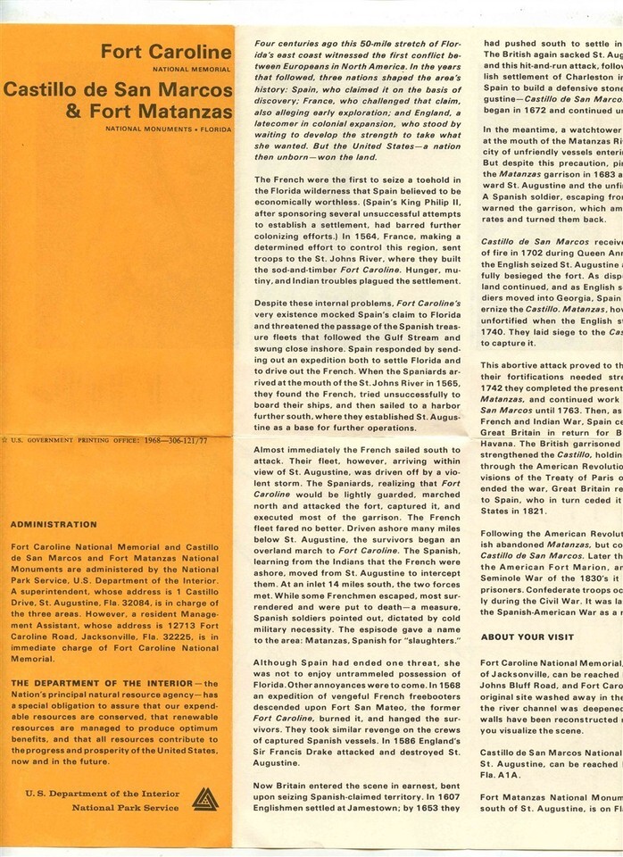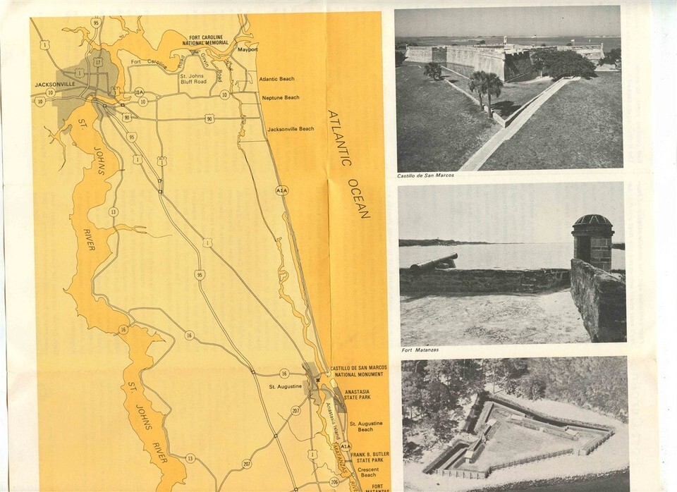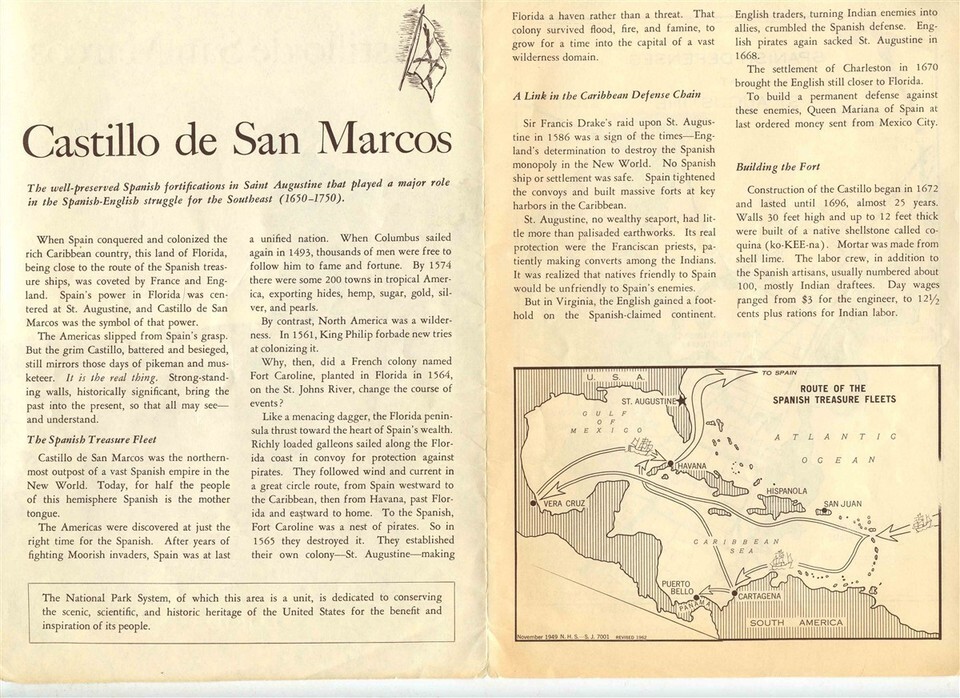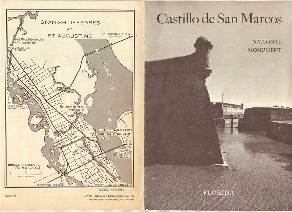 A large well illustrated 8 panel fold out brochure. Castillo de San Marcos National Monument Florida . Dated 1963. Has photos, history and more.