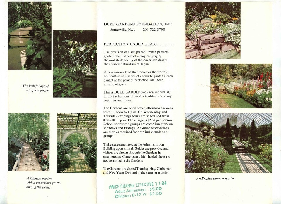 A nicely illustrated 6 panel fold out brochure. Duke Gardens Brochure. Located in Somerville New Jersey, dated 1984. HAs photos, map, directions and more