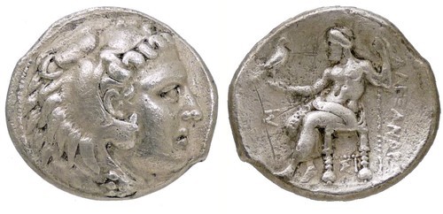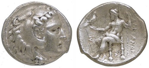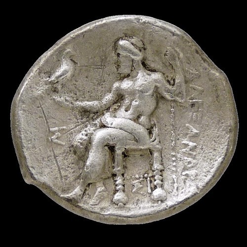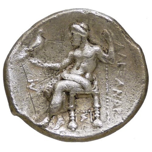 Reverse: Zeus seated left, holding long scepter in his left hand and, in his extended right hand an eagle standing right with closed wings; A?E?AN?POY right (of Alexander in Greek); ? (date) in left field, ?I (=Sidon) below throne.