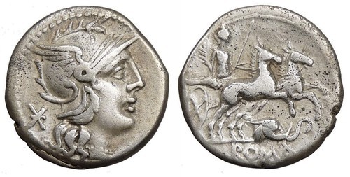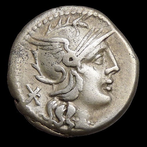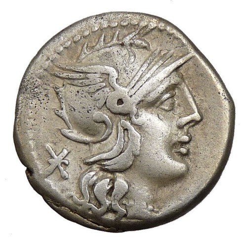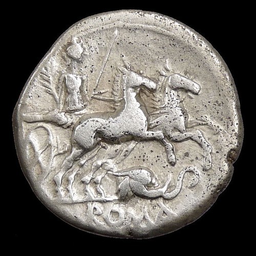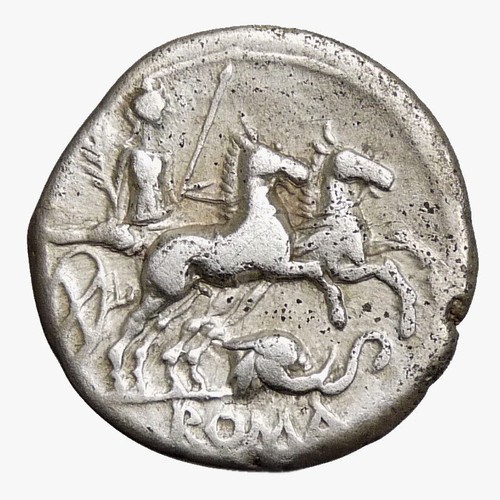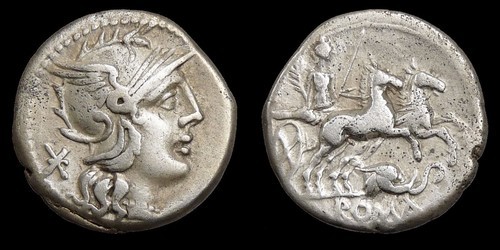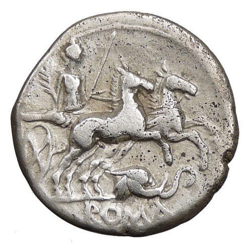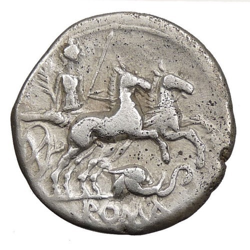 Reverse: Pax driving galloping biga (two horse chariot) to right, holding olive branch, sceptre, and reins; elephant's head below~The elephant's head on the reverse, refers to the victory of L. Caecilius Metellus in 250 BC over the Carthaginians at Panormus. VERY RARE without bell around neck of elephant, ROMA in exergue.