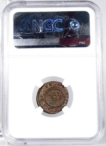 "Wishes for the 5th reign anniversary of our dear cesars". VOT?V within Wreath; mintmark RS in exergue--Rome mint mark.