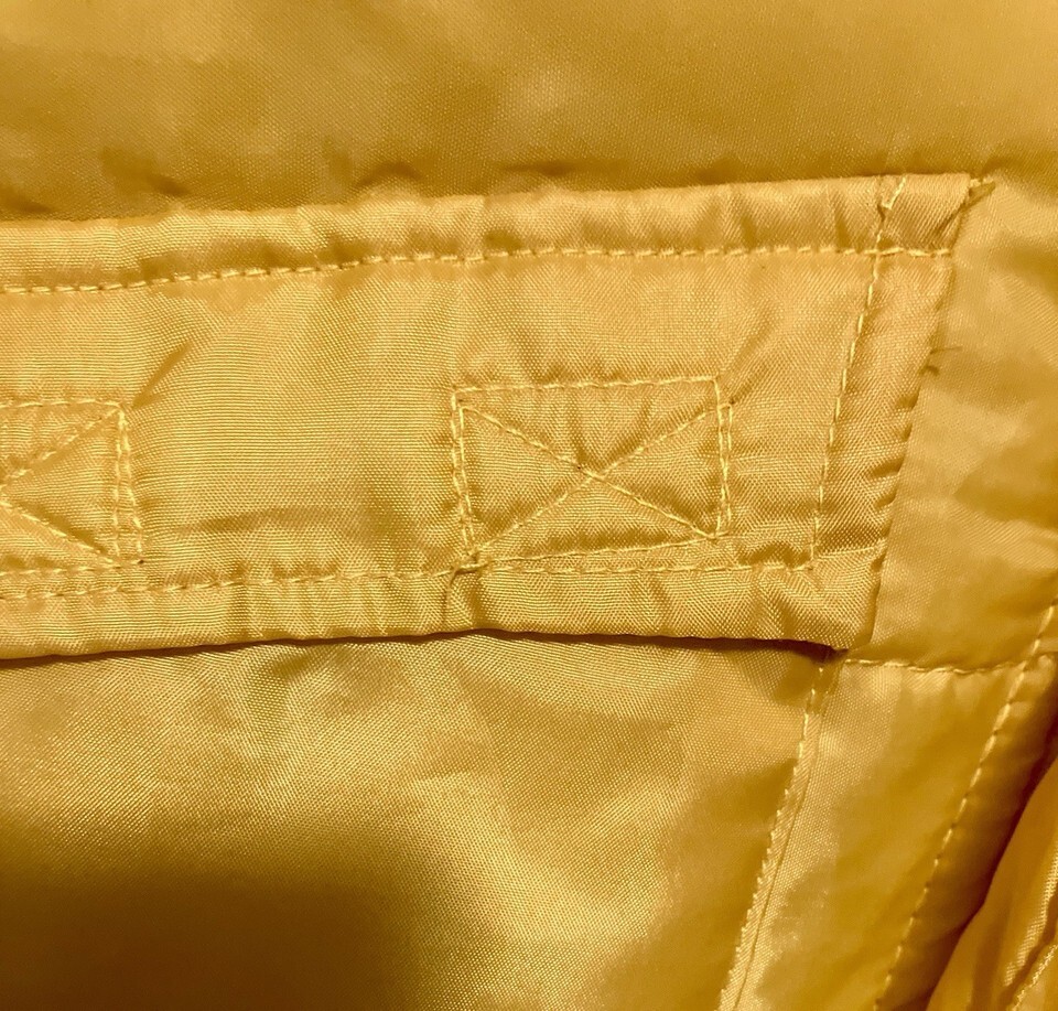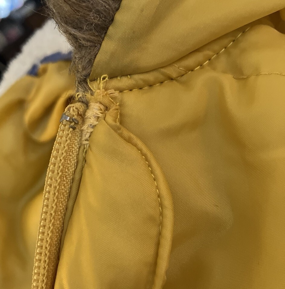 Jacket is in Very Good Condition with lots of life left! There are a couple of minor stains on the pockets and the fabric at the top of the zipper has been repaired (see pics). Fur trim is somewhat matted.