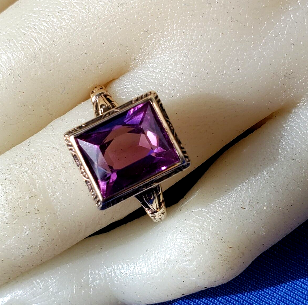 Amethyst European Deco Engagement Ring Vintage Designer Solitaire Solid 10k Gold