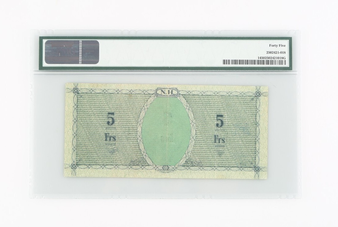 Sigillato in un supporto PMG con il titolo "Nuova ebrides / Problema di emergenza - Seconda Guerra Mondiale // Pick# 1 Nd (1943) 5 Franc // S / N 01673 - Servizi NationAux Francais"