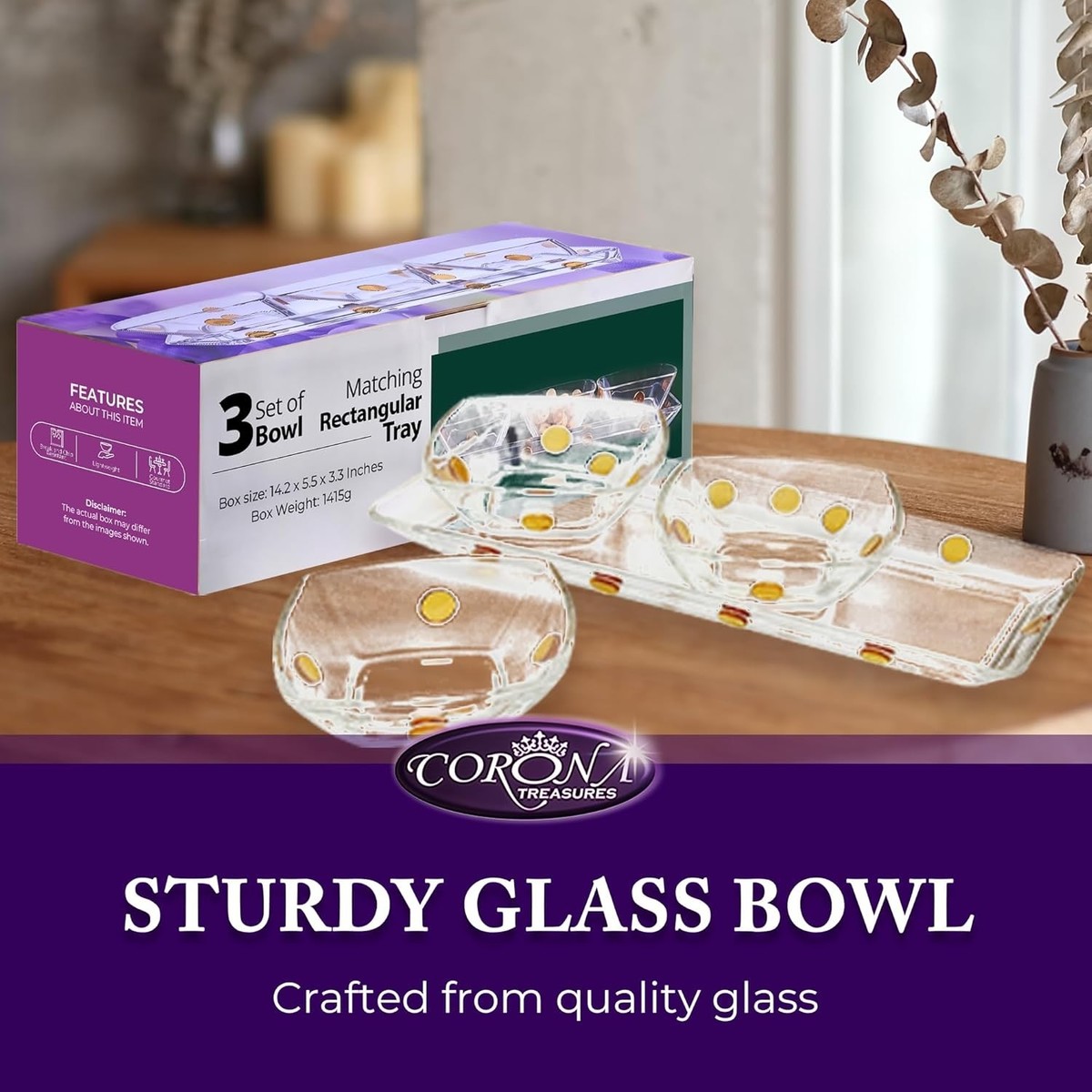 SET INCLUDES 3 SQUARE BOWLS MATCHING RECTANGULAR TRAY: This serving set features three chic square glass bowls and a matching rectangular tray, all adorned with subtle, elegant gold dots. Designed for showcasing your favorite condiments, appetizers, snacks, and more.