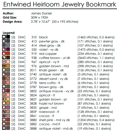 The Entwined Heirloom Jewelry pattern features a sophisticated palette of 20 DMC colors carefully selected to evoke precious metals, romantic jewel tones, and the warmth of intimate connection: