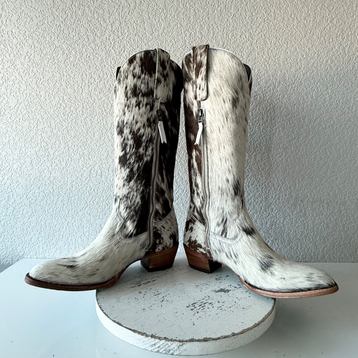 Lane Boots Plain Jane western boots crafted in genuine black and white cowhide with natural hair-on-hide texture. Classic pull-on silhouette with side zipper for easy on/off and a stacked wooden heel. Each pair features unique cowhide patterning?no two are exactly alike.