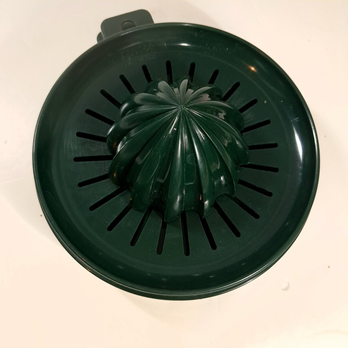 Dark green plastic. Fits 1 quart pyrex measuring cups(not included) See pics. Includes juicer with cap, Grater, and lid