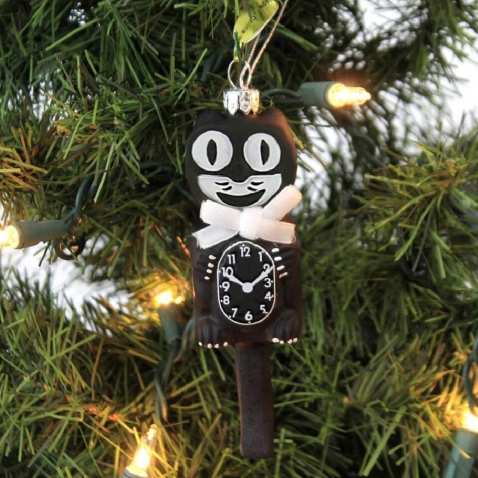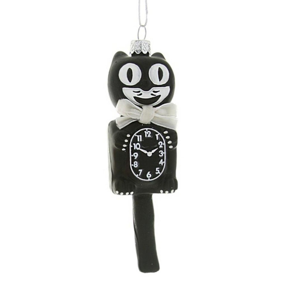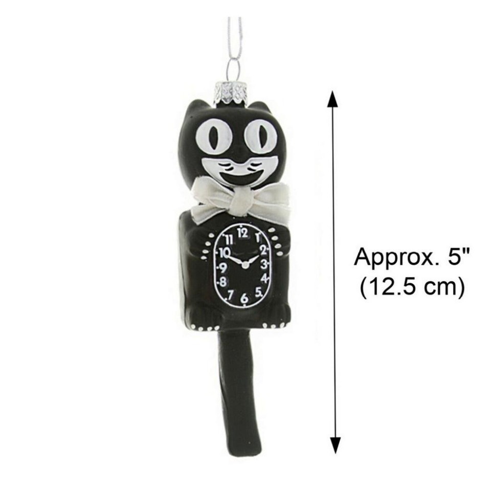 RETRO CAT CLOCK ORNAMENT 5" Glass Cute Black Kit Kitty Cat Christmas Tree NEW