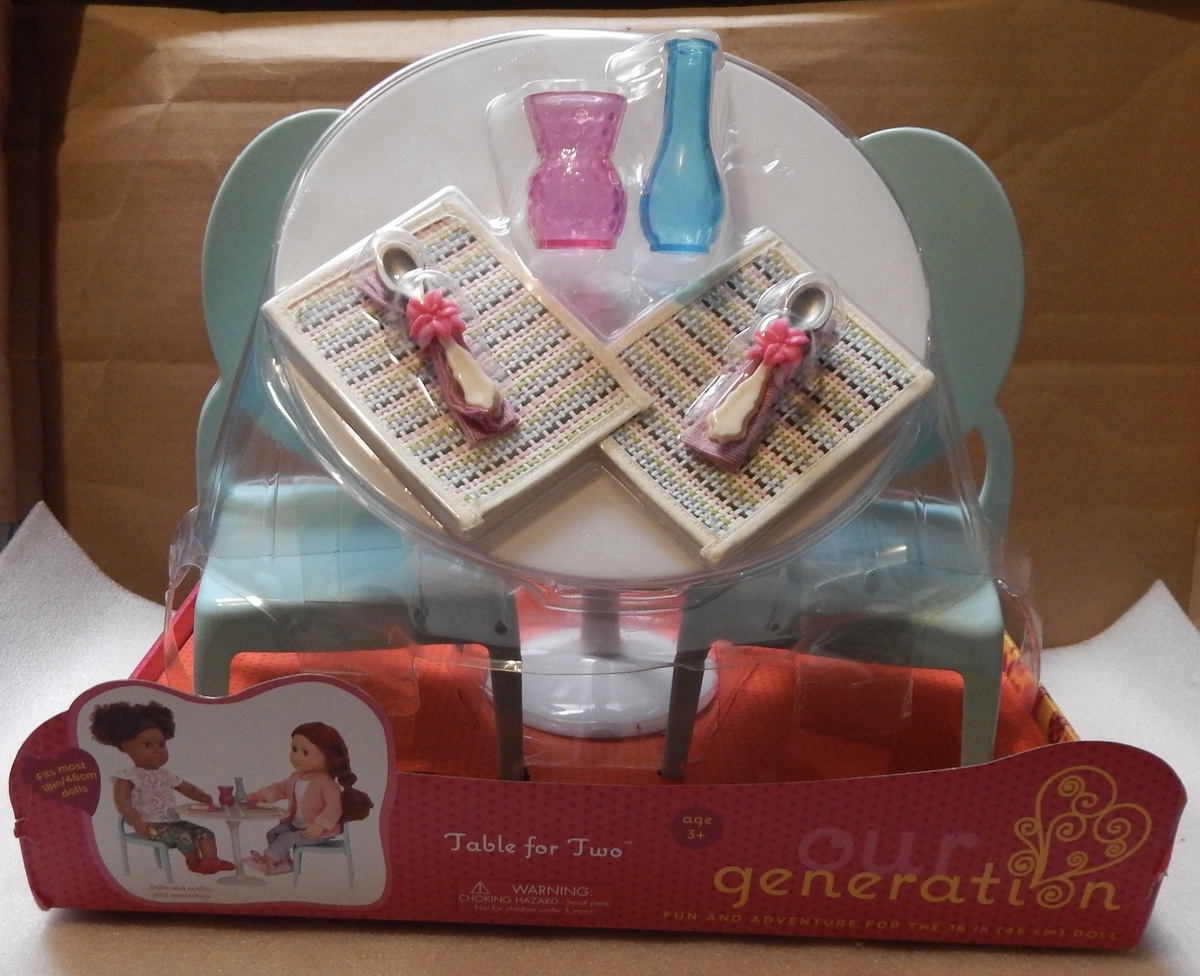 The Our Generation Table For Two is a colorful plastic furniture set designed to fit 18-inch dolls like American Girl. This original product from Our Generation includes a multicolor table with two chairs, perfect for creating a cozy kitchen setting for play dolls. With no assembly required, this 2020 manufactured set is a versatile addition to any dollhouse or playroom, providing a realistic and fun environment for imaginative play. Made in China, this table and chair set is compatible with 18-inch girl dolls and adds a touch of charm to playtime scenarios.