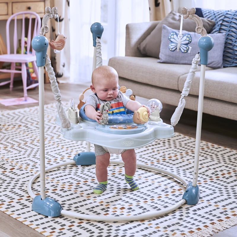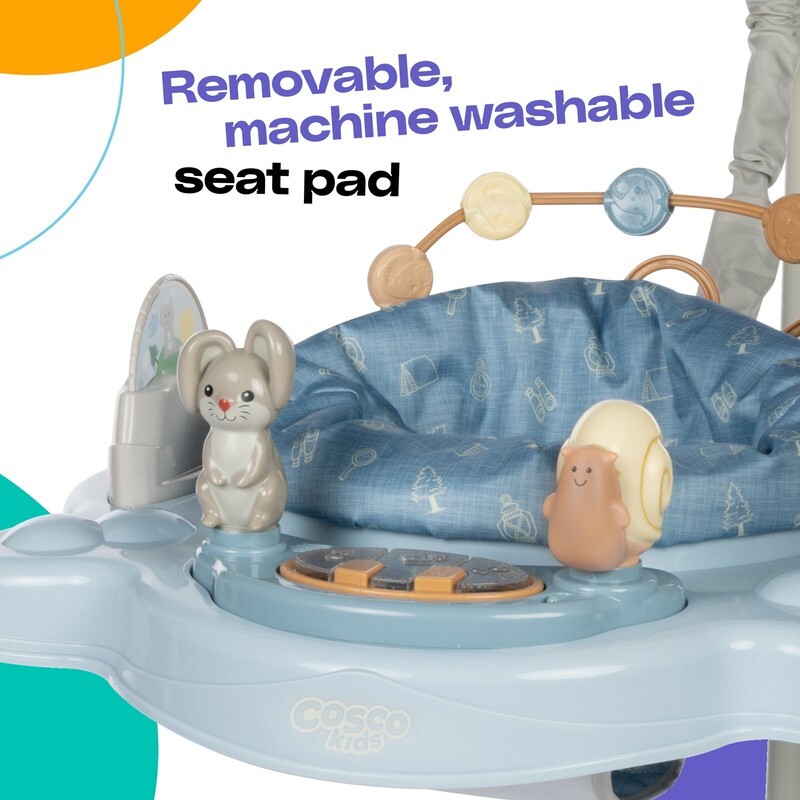 Cosco Kids Twirl-and-Bounce Activity Center, Forest Friends 3-in-1 play center, bouncer, and jumper Legs detach for compact storage Built-in toys with music, lights, and sounds Seat spins 360 3-position adjustable height Removable, machine-washable seat Assembled Dimensions: 34.45 in x 34.45 in x 38.39 in To view the product law label, visit: and enter [884392001292]