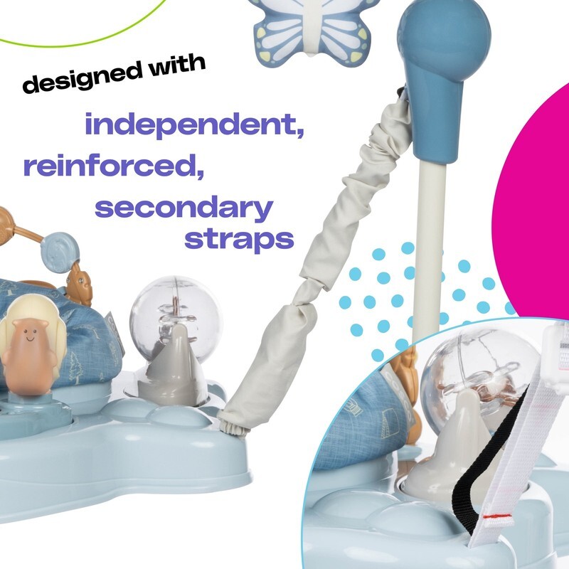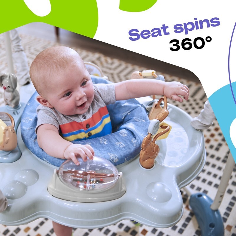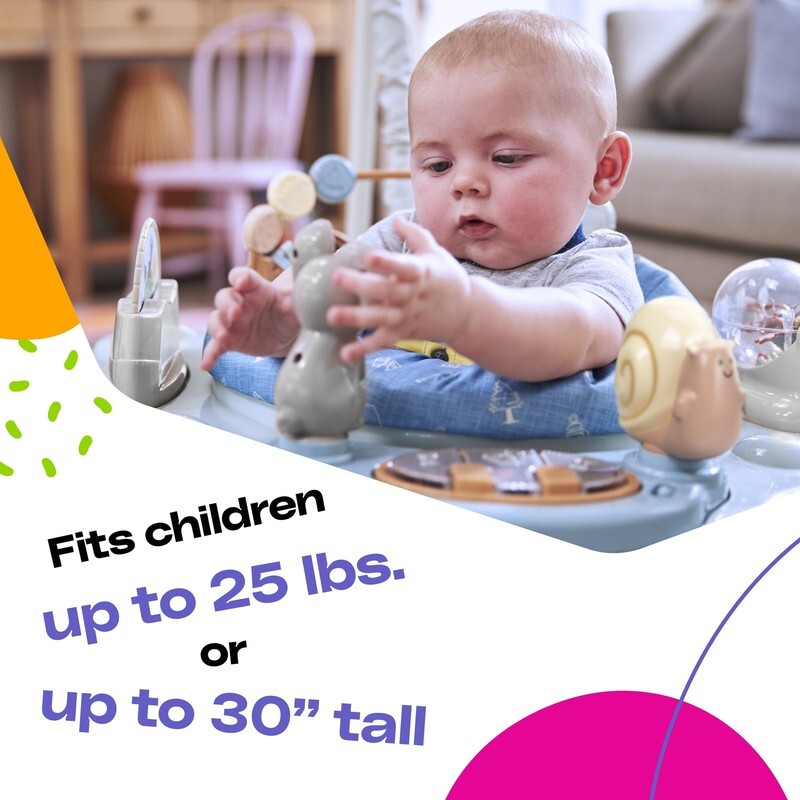 The Twirl-and-Bounce Activity Center is the perfect place to keep your baby entertained. Baby can bounce and play in the seat that adjusts to three different heights and spins 360. The activity center also features built-in forest animal toys to stimulate and entertain your baby, including a spinning rattle, a shape slider, and more?with lights, music, and sounds. The seat is removable and machine-washable for easy clean-up. When baby?s done playing, the legs detach for compact storage.