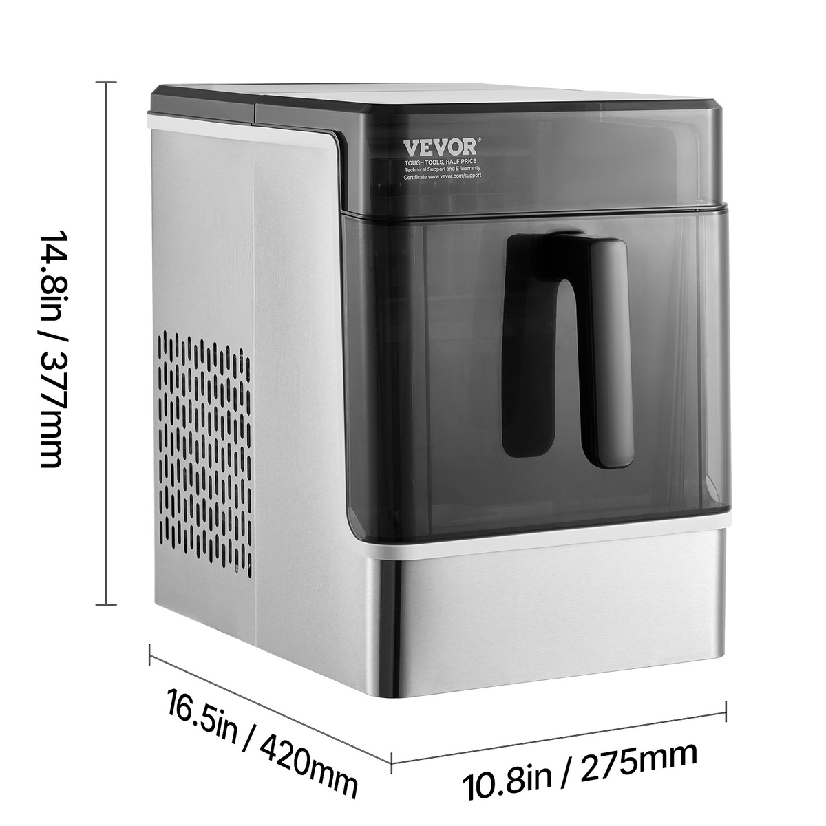 Quiet and Portable: The countertop ice machine operates at a noise level lower than 65 dB, similar to the sound of a working refrigerator. The compact design includes a handle and measures 10 x 14 x 15.2 inches / 255 x 355 x 385 mm, making it suitable for use in rooms, offices, restaurants, and more