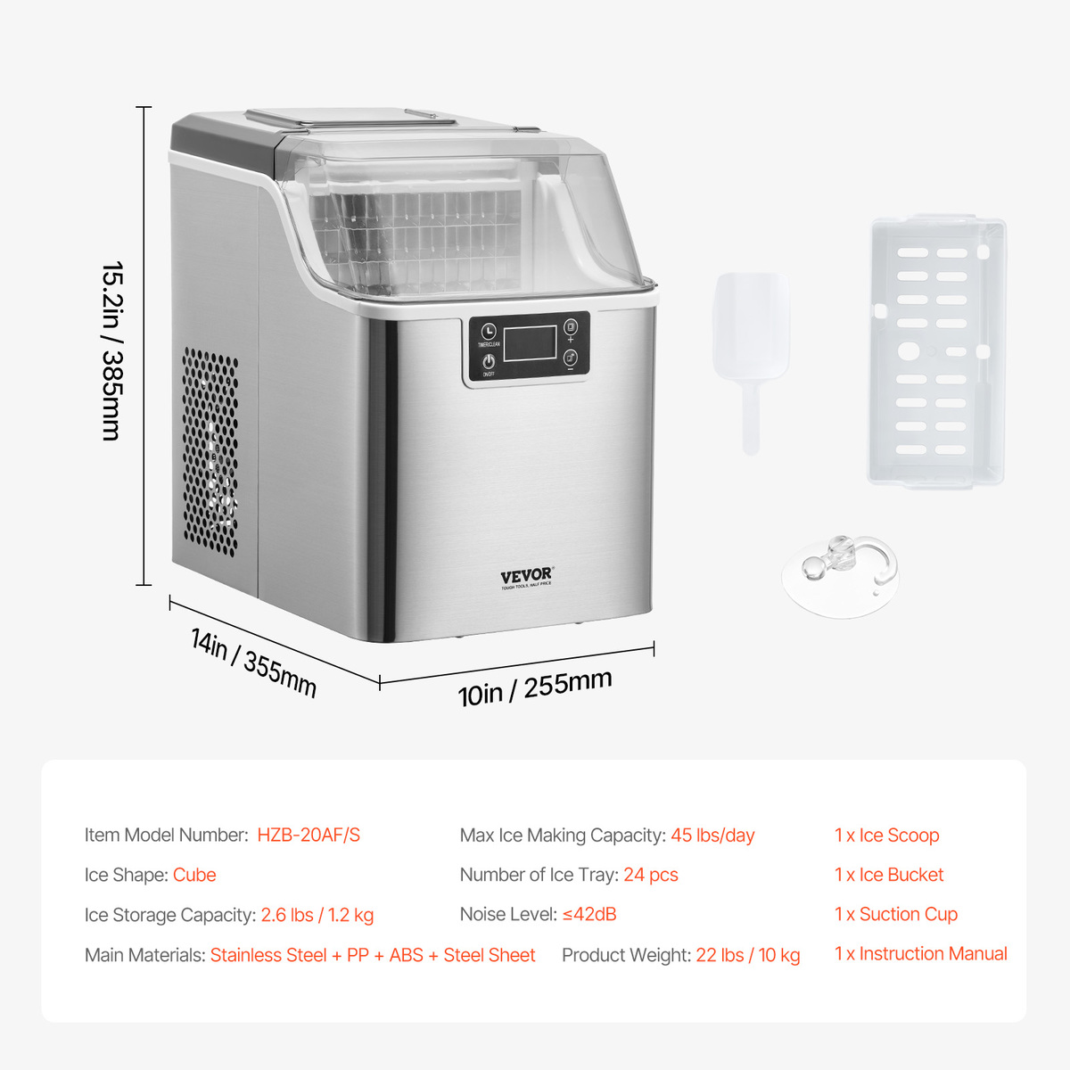 Quiet and Portable: The countertop ice machine operates at a noise level lower than 42 dB, similar to the sound of a working refrigerator. The compact design includes a handle and measures 10 x 14 x 15.2 inches / 255 x 355 x 385 mm, making it suitable for use in rooms, offices, restaurants, and more.
