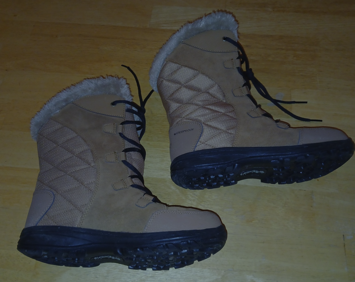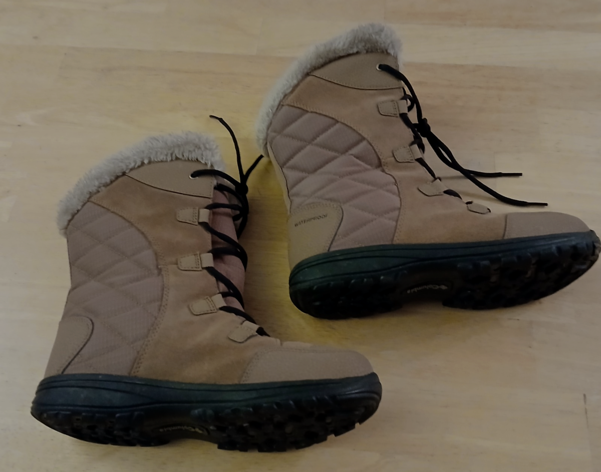 THIS IS A GREAT PAIR OF LADIES COLUMBIA BROWN MID-CALF LACE-UP BOOTS W/FAUX FUR AROUND TOP IN A SIZE 8.5 US. THEY ARE IN EXCELLENT, VERY GENTLY WORN, CONDITION.