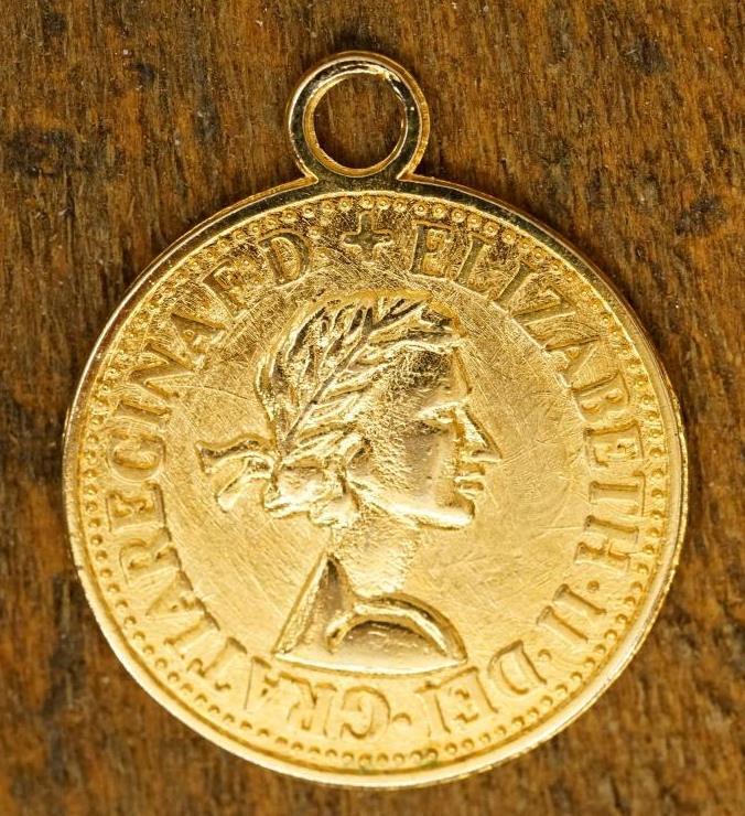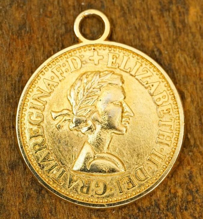 Vintage Costume Jewelry Coin Elizabeth II Gold Tone Metal Necklace Pendant - measures 25mm across. Gold tone base metal. No smoke or pet odors. Ready to hang on your favorite chain.