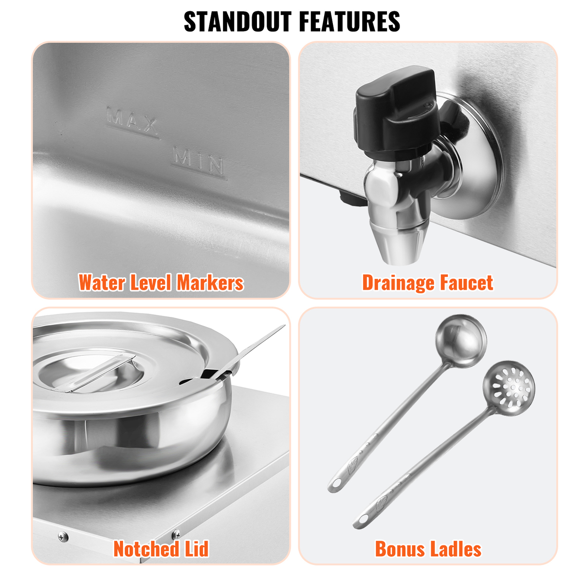 Details Made for You: The soup pot is thoughtfully designed with water level markers inside for effortless water maintenance. The container features a faucet for draining water after use, reducing the hassle of cleaning the machine’s interior. Additionally, two extra long-handled ladles are included, perfectly suited for deep pots.