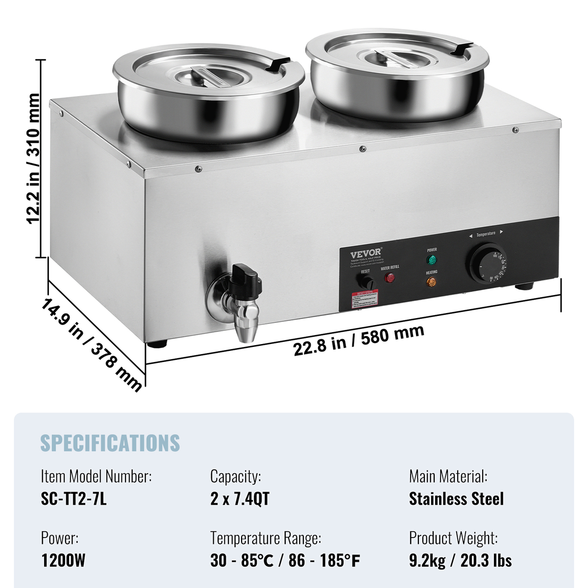 VEVOR Electric Soup Warmer, Dual 7.4QT Stainless Steel, 1200W, 86~185°F Temp